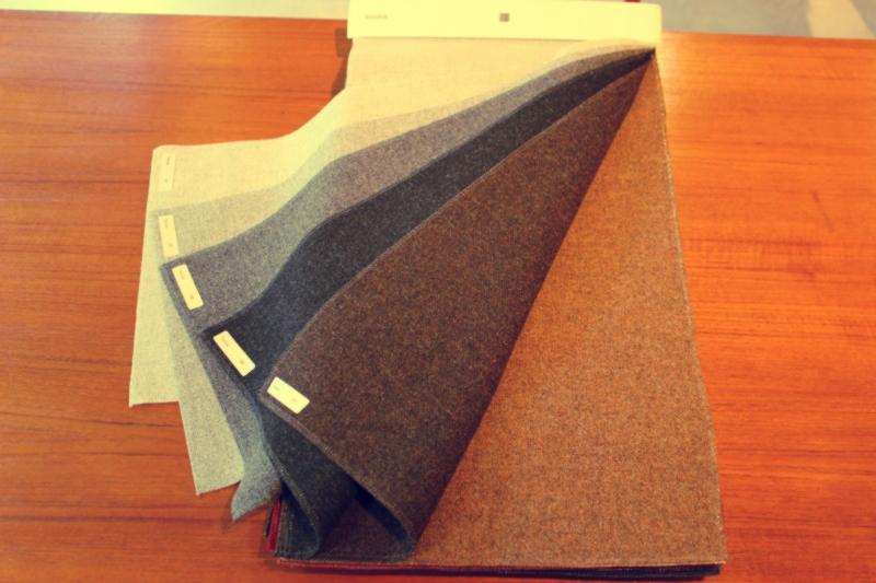 羊毛にもともと存在する油分が汚れを防ぎ、耐久性が強いのが特徴です。カラーバリエーションは今回届いたサンプルの中で最も多いですね。