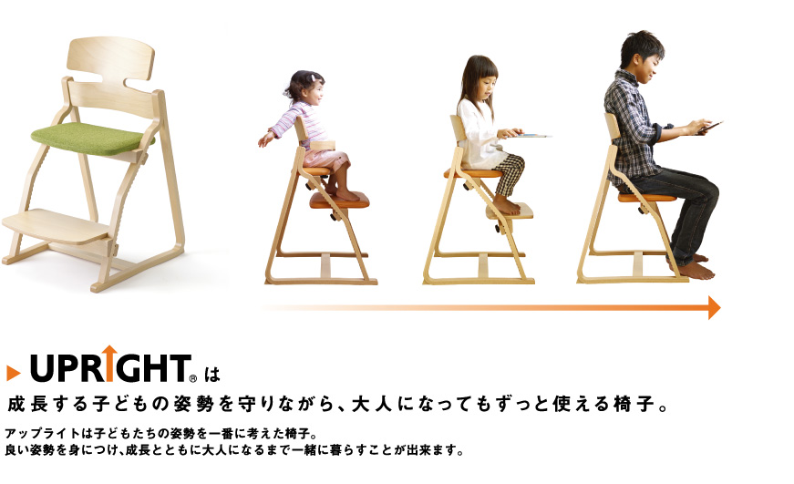 UPRIGHTチェアは子供の正しい姿勢を守りながら大人まで使える子供椅子として広く認知されています。