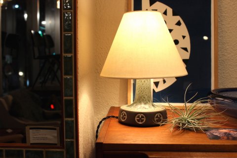このランプは緑の釉薬の流れ方が綺麗でサイズ的にベッドサイドのランプとしてお使い頂くと良いかもしれませんね。