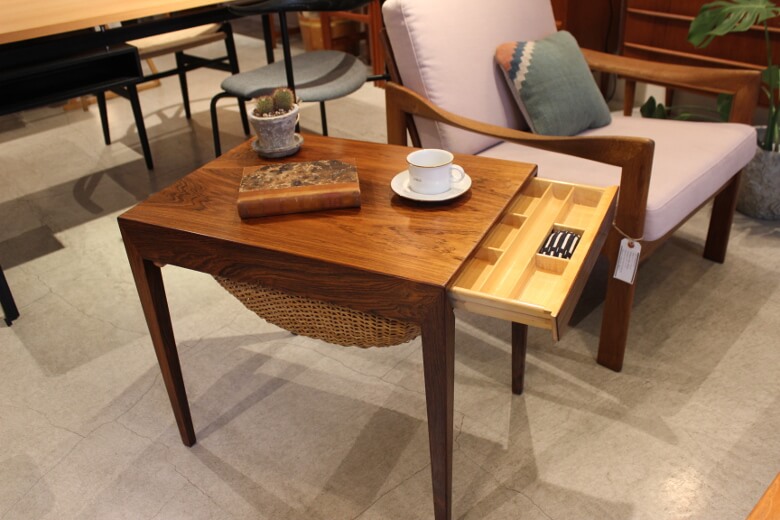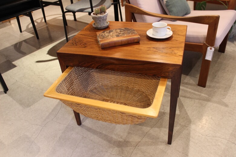 一見、籐の収納かごが付いているおしゃれなサイドテーブルに見えます。 ですが実は、サイドに引き出しが付いていているので、引き出しを開けると編み物の道具や刺繍道具が収納できるようになってるんです!