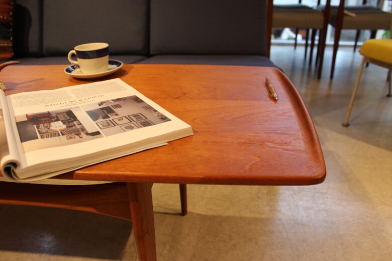 コーヒーテーブルのサイドの端に筆返しが付いていて、物が落ちないように工夫されたデザインになっています。