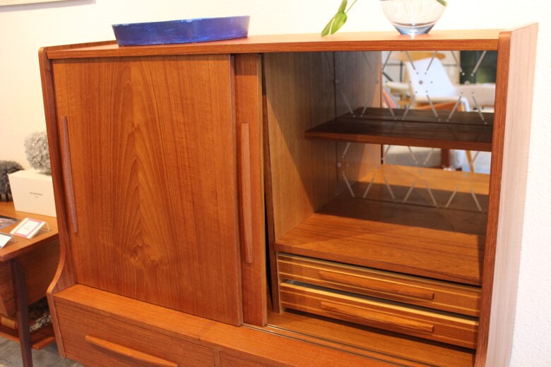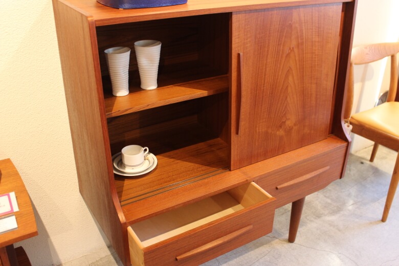 こちらのキャビネットは正面の引き戸を開けると、右側と左側の仕様が違うのです。