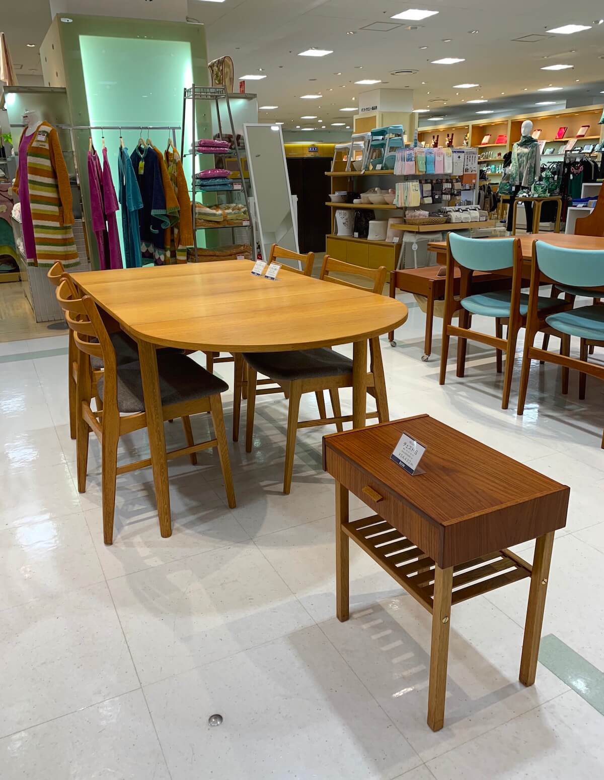 スタンダードなエクステンション付きのダイニングテーブル、サイドテーブルの役割もしてくれるキャスター付きのソーイングテーブルも展示してあります。