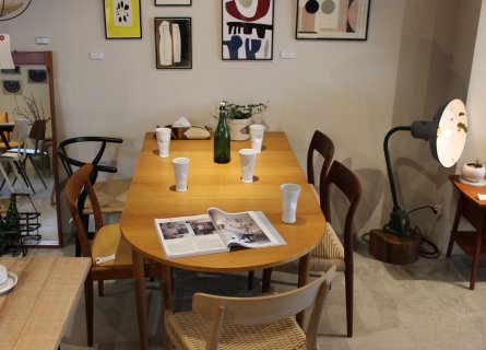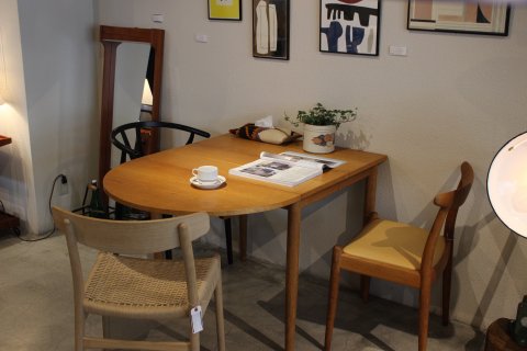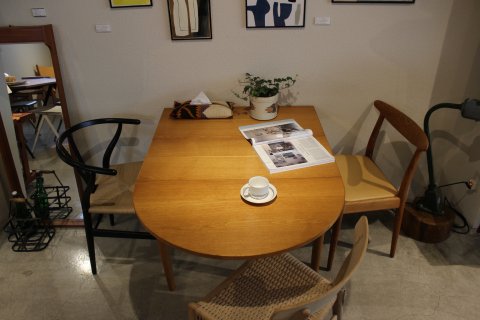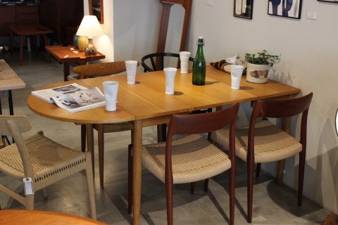 オークの色と半円の形がやわらかい印象になって、明るい雰囲気の食卓になりますね~、違う椅子で揃えても相性バッチリです◎