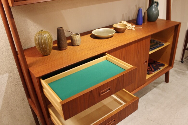 さらに左側の一番上の引出しには、容易に取り外しできるトレーとフェルトが付いている引出しになっておりますので、来客時などに必要なものを収納しておけば、さっと取り出せて使い勝手が良さそうです◎