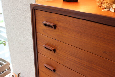 こちらのチェストはデザインも凝っていて、フレーム部分が丸みを帯びたチークのコントラストになっており、取っ手部分も引き出しやすいデザインで手が込んだおしゃれなチェストなんですよ!