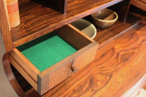 両サイドの小さな引き出しには上品なグリーンのフェルトが敷かれています。