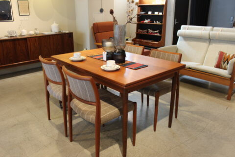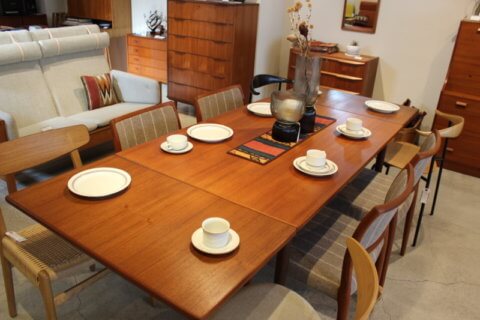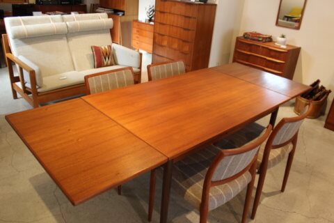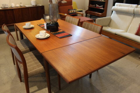 普段は4人掛けでコンパクトサイズですが、天板を左右に引き出すだけで簡単にテーブルが拡張できる、便利なエクステンション付きのテーブルになります。