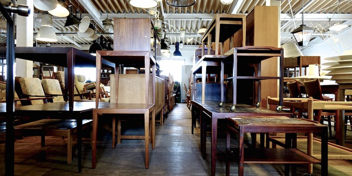 デザイン性と機能性を兼ね備えた北欧ヴィンテージ家具やインダストリアルアイテムが所狭しと置かれる店舗と工房が一緒になったベルベットウェアハウス。