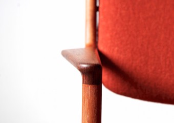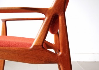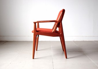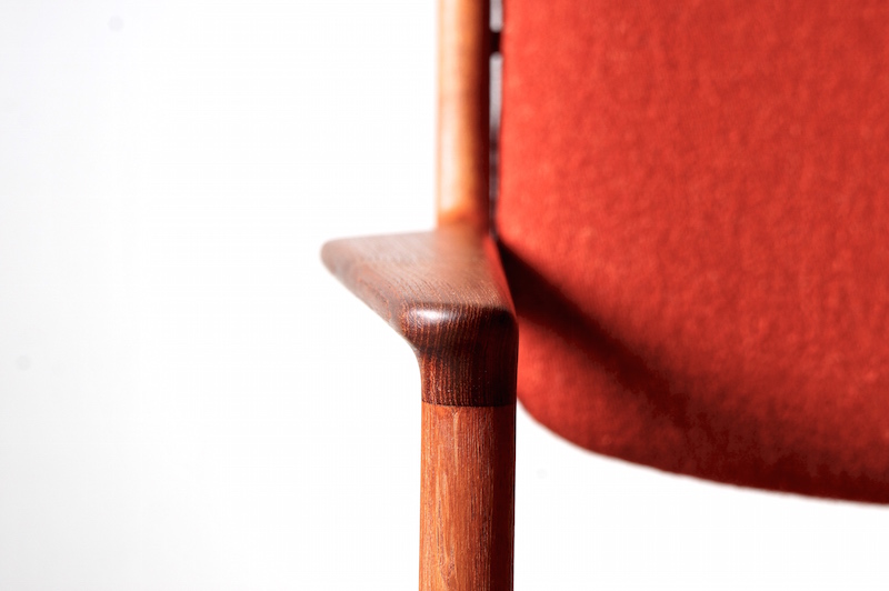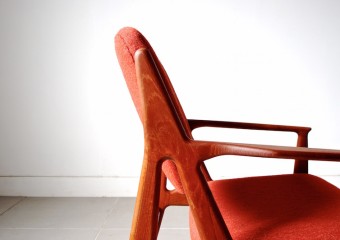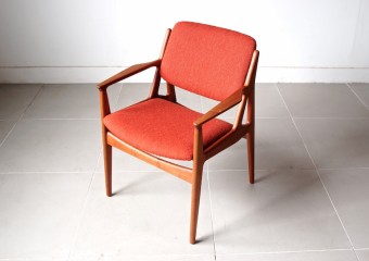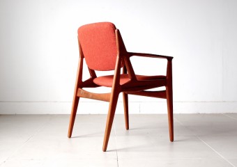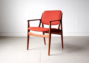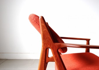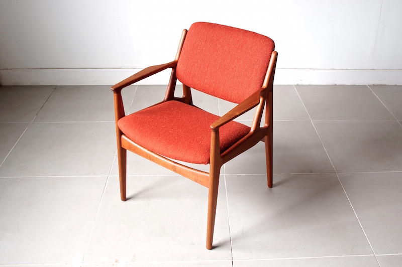 デンマークのデザイナーArne Vodder(アルネ・ヴォッダー)が1957年にデザインし、優れた技術で多くのデザイナーの家具をカタチにしたVamo Møbelfabrik社より製造されたアームチェア「Ellen」。 緩やかに先端へ向けて傾斜したアームが肘を掛けると大変心地よく、稼働する背もたれが体を動かしても腰にフィットし、非常に座り心地の追求された椅子です。ヴォッダーらしい凝ったデザインもこの椅子の魅力です。 ファブリックはケアロップ社のBlanシリーズにて張替え、非常に雰囲気のある椅子に仕上がりました。