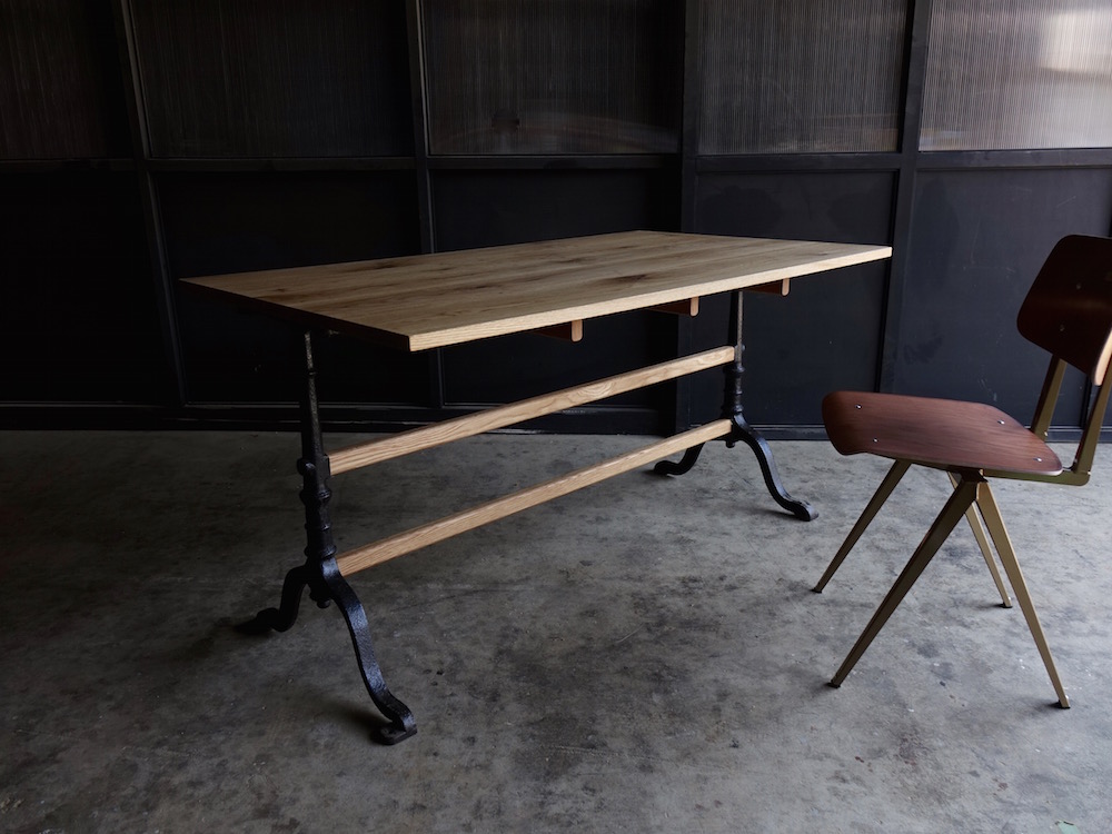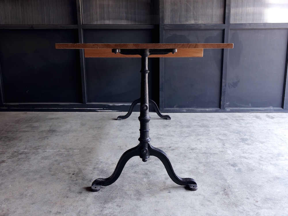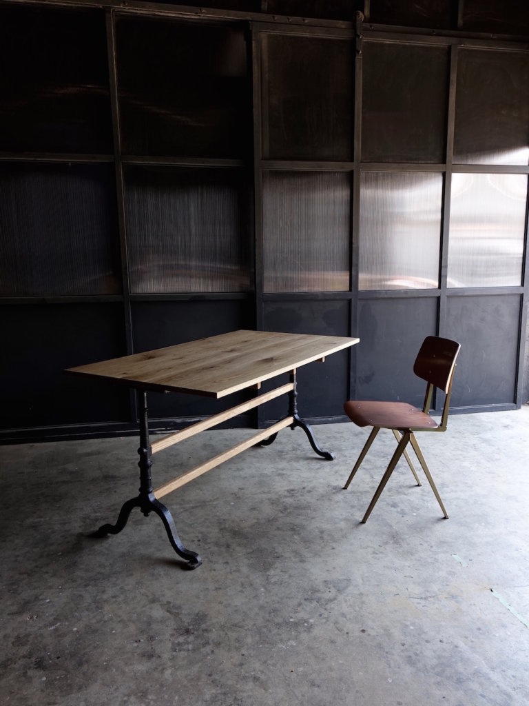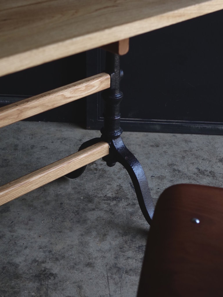ヨーロッパの古びたアンティークレッグを再利用したダイニングテーブルです。経年の味わい深く経年変化した金属脚に直線的なオーク無垢材の木部との組み合わせはモダンとアンティークの間に位置付けられたような佇まいです。幅140cmとコンパクトながらも内寸127cmと椅子を2脚並べても十分なスペースが確保されております。古い素材と新しい素材が融合したコントラストは椅子選び、空間作りの可能性を広げてくれる美しいテーブルに仕上がっております。