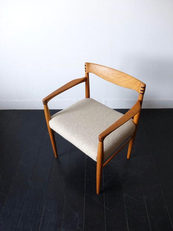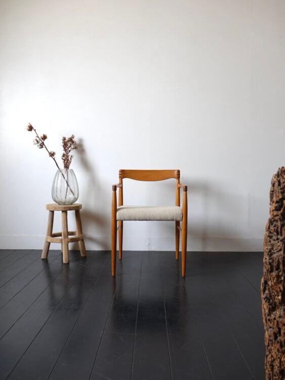1960年代に生産されていたH.W.Klein(ヘンリー ウォルター クレイン)デザインのデンマークBranin社製ヴィンテージアームチェア。オーク無垢材を削り出して作られた背もたれやアームの形状が優美で、接続部はローズウッド材をフィンガージョイントさせた美しいアクセントが施されています。華奢なフォルムですが収まりの良い肘掛けと絶妙な背もたれの曲線は程よく身体にフィットし、安定感のある広い座面で非常に良い座り心地を表現されています。ファブリックにはヨーロッパで人気の高いスペインのLes Criationsのウールとビスコースで織ったエレガントで洗練された風合いのベージュカラーで張り替え、とても落ち着いた雰囲気に生まれ変わりました。