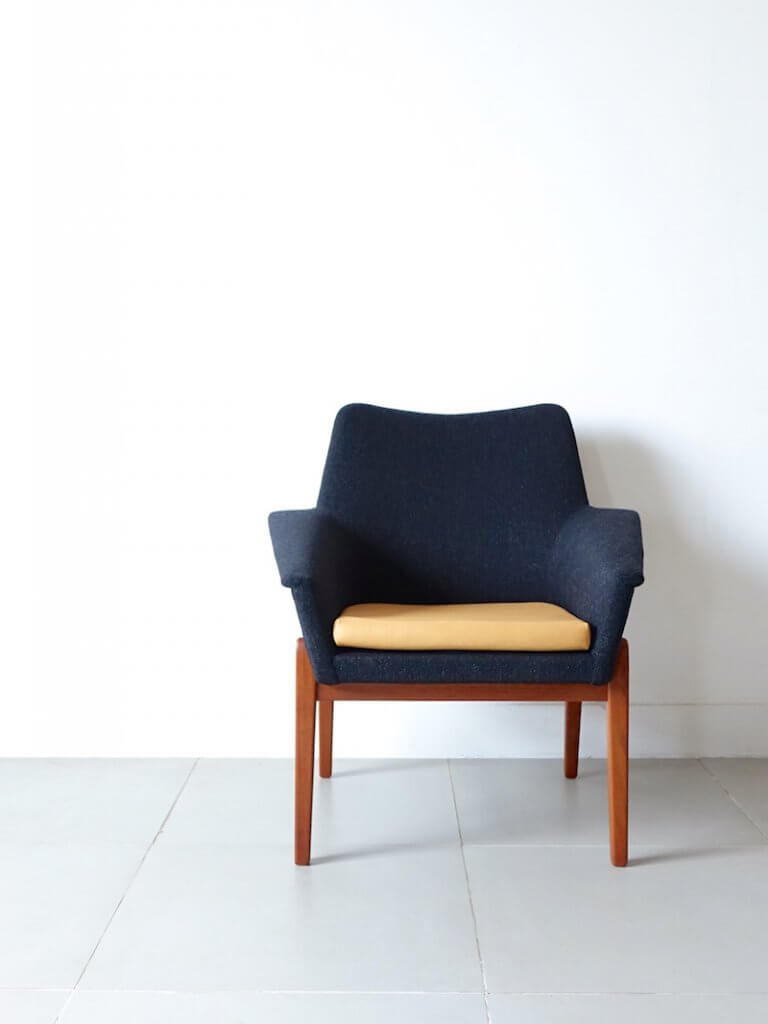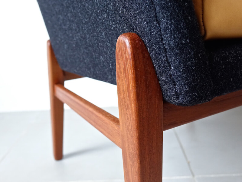 1959年にスウェーデンのIre Möbelより製造されていたレアなヴィンテージアームチェア。チーク材のユニークなフレームに乗った浮遊感あるシェルデザイン、曲線と直線を美しく組み合わせたモダンな外観とは裏腹に、座るとシェル全体の緩やかな傾斜と背と肘掛へと繋がる曲線が包み込まれるような優しい座り心地を創り上げています。ファブリックの張替えはベースにデンマークの老舗ケアロップのブラック生地にアクセントとしてキャメルレザーを座面クッションに採用し、1939年創業のIre Möbelの高い技術と共に北欧デザインの深みを感じさせてくれる美しい逸品に仕上がりました。
