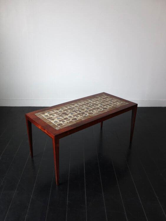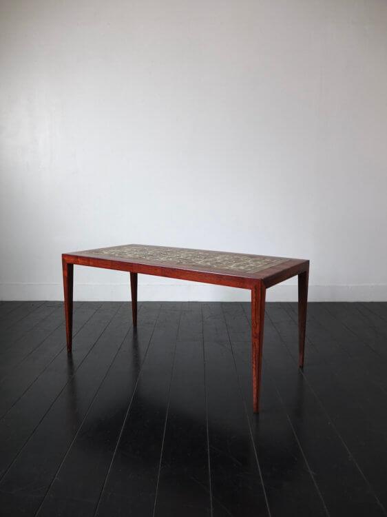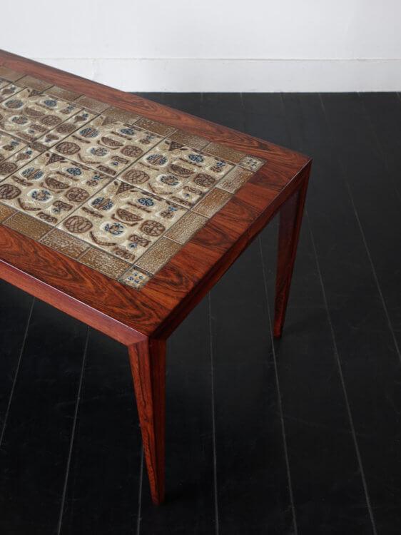 1960年代にデンマークの現存する老舗家具メーカーHaslevとセラミックブランドRoyal Copenhagen(ロイヤルコペンハーゲン)がコラボレーションにより発表された家具シリーズのローズウッド製ヴィンテージタイルトップテーブル。フレームデザインはHaslevのSeverinHansen Jr.(セヴェリン ハンセン)、タイルはロイヤルコペンハーゲンのスタジオデザイナーであったNils Torsson(ニルス・トーソン)を中心にデザインされたBACA(バッカ)シリーズが組み込まれ、その独特で繊細なデコレーションは和洋問わず様々なシーンでの上品なアクセントとなります。タイルトップ天板は熱や水分に強く、デザインだけでなく多くの実用性を兼ね備えているのがこのシリーズの特徴です。