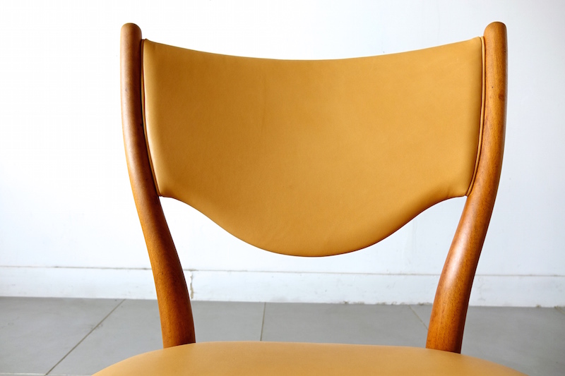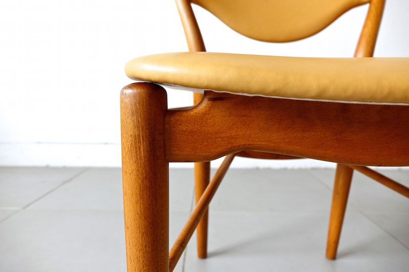 “Bo 63″は1952年に北欧デンマークのデザイナーFinn Juhl(フィン・ユール)により彼の多くのプロダクトを手掛けたBovirkeによって生産された名作椅子です。フィン・ユールの残した代表作チーフテンチェアやNVシリーズの様に同氏ならではの美しく削り出された曲線と直線を有機的に組み合わせた”Bo 63″は、どの角度から見ても美しく、その佇まいは様々なシチュエーションをエレガントに演出してくれます。背と座のレザーは経年変化したビーチ材との相性の良いキャメルレザーにて張替えを行い、上質でヴィンテージとしての風合いを十分にお愉しみ頂ける仕上がりとなりました。