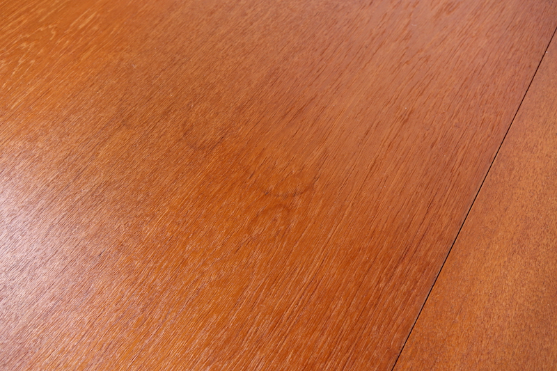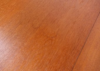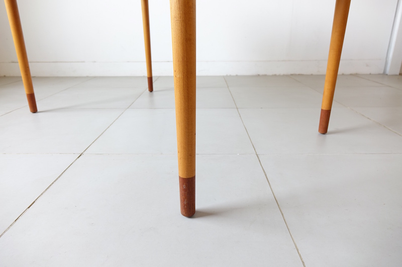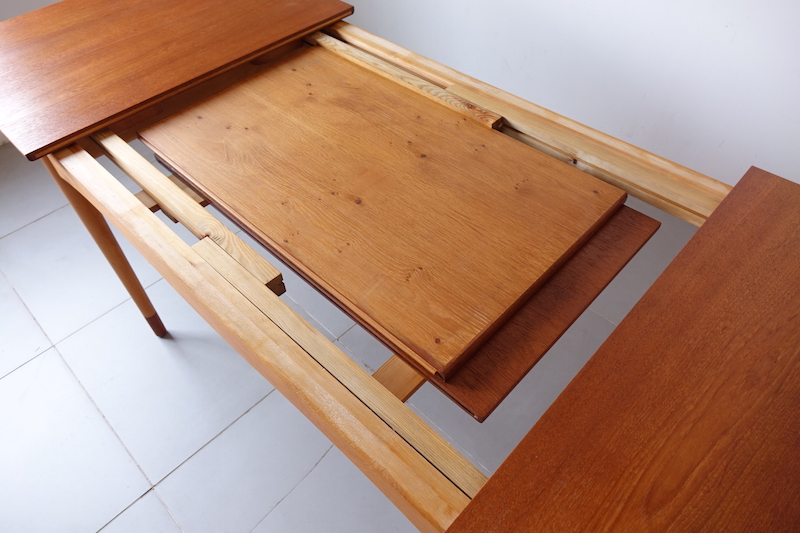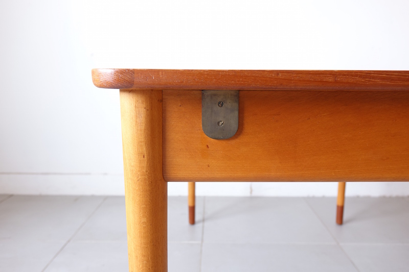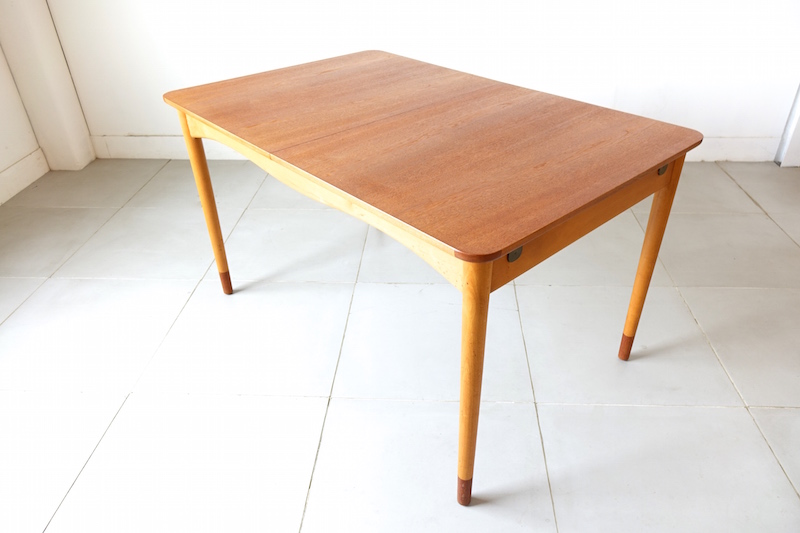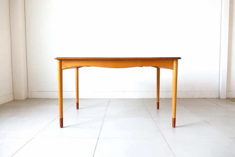 一方のダイニングテーブルはビーチ材をベースに天板と脚先にチーク材を使用した市場でも大変希少なエクステンションテーブルです。妥協を許さずに細部までフィンユールの拘りをかたちにしているBovirkeの高いクオリティを感じることが出来、天板下のレールにはアクセントとなる真鍮プレートや脚先にはチークのキャップなど施されるなど、北欧家具デザインの歴史を造ったフィン・ユールの繊細な世界観が美しく表現された逸品です。通常幅130cmの本体は脚が両端に組まれる事でコンパクトながらも内幅はしっかりとスペースが確保され、複数名での使用にも圧迫感が軽減されるデザインとなります。また内臓する2枚のエクステンションの取り付けにより最大230cmまで拡張する事が出来、様々なライフスタイルに合わせたご使用が可能となるのも魅力です。