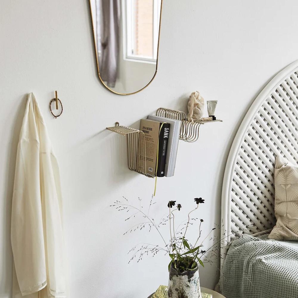曲線が美しいゴールドカラーのウォールシェルフ。 本や雑誌、小物などをディスプレイ感覚で収納でき、壁面をおしゃれに演出してくれます。