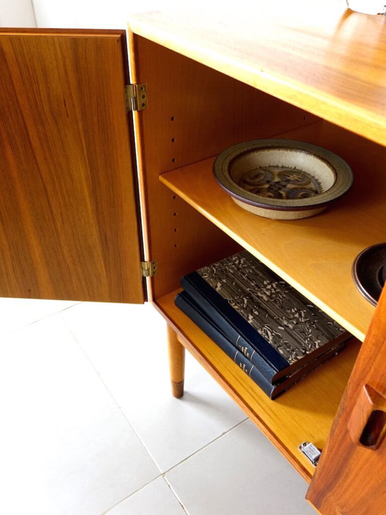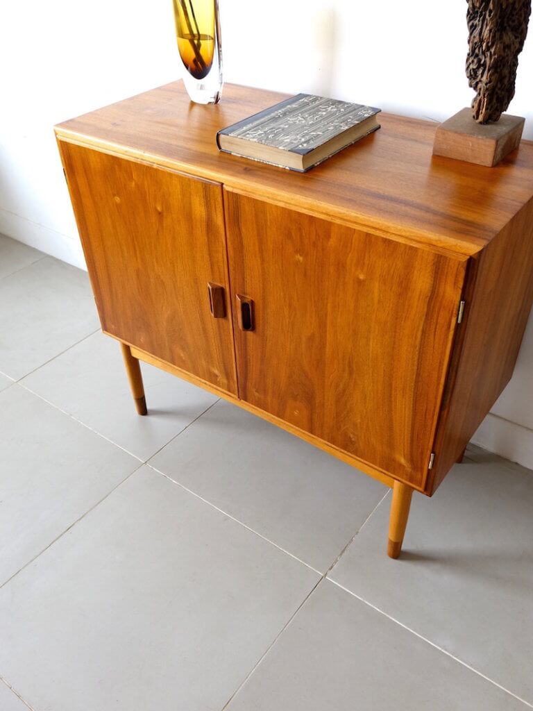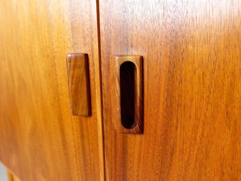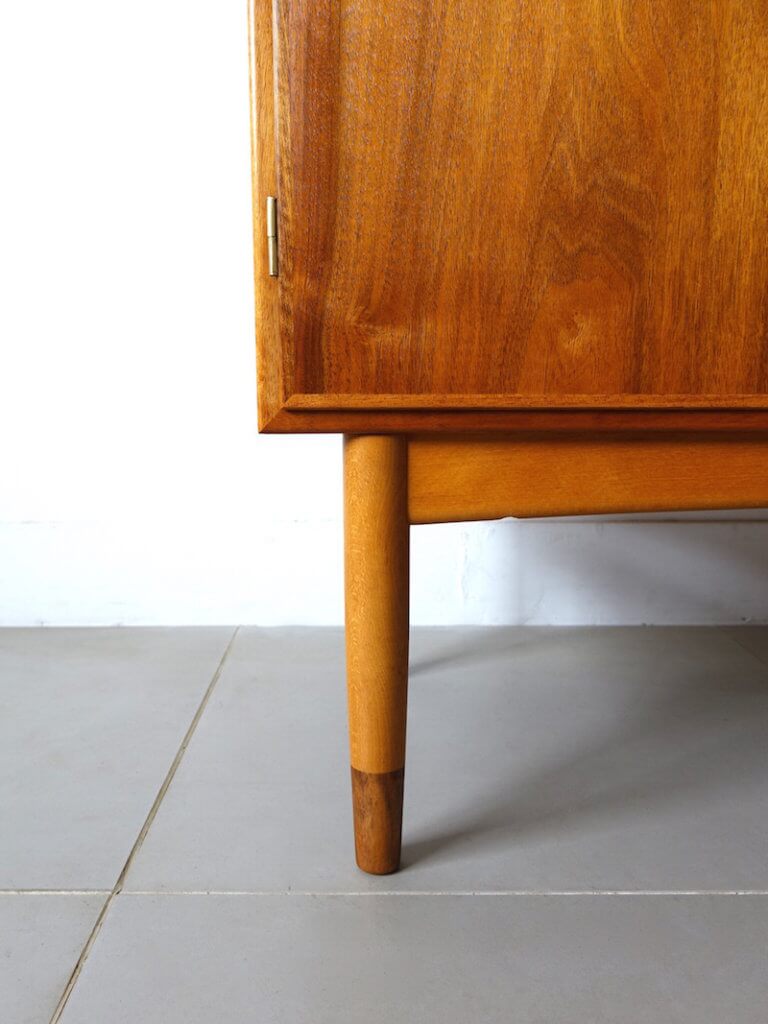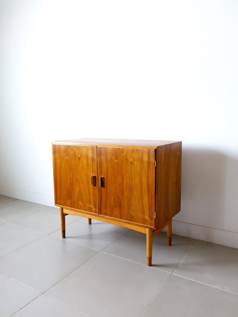 Borge Mogensen(ボーエ・モーエンセン)がデザインしたSoborg Mobelfabrik社製の大胆な観音開きビンテージキャビネットです。モーエンセンらしい無駄な装飾を省いたデザインは素材の持つ温かみを見事にデザインへ落とし込まれています。外観は本体部分にマホガニー材、脚部はコントラストが印象的なビーチとマホガニー、シンプルでユニークな取手の形状が良いアクセントとなり使いやすく、可動棚と共に収納力にも優れた作品です。改めてマホガニー材の美しさも感じさせてくれる杢目を持ちます。