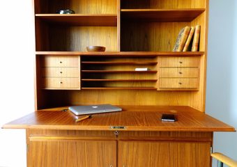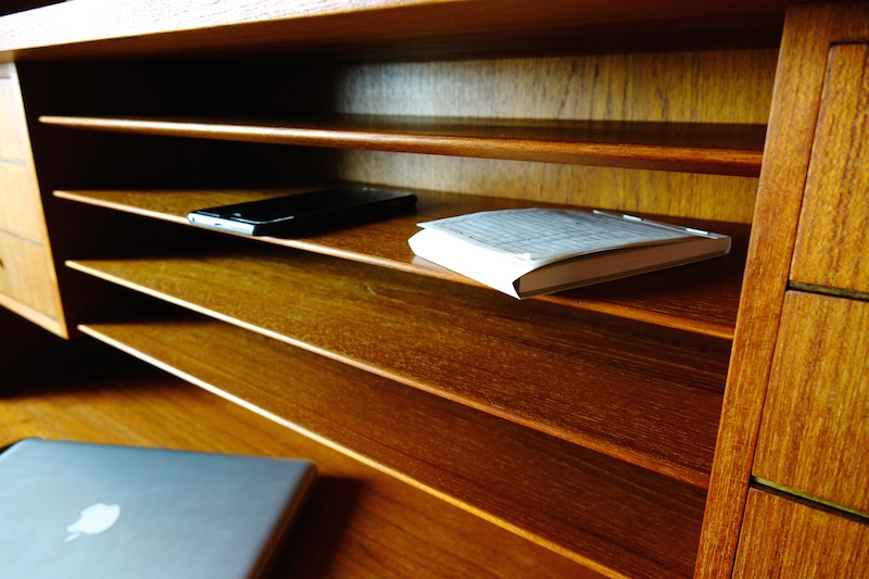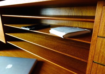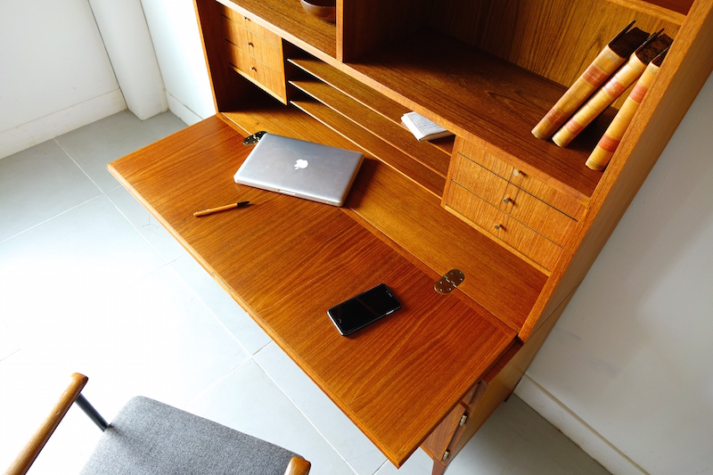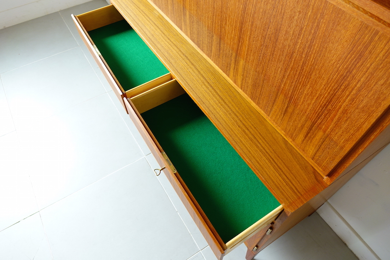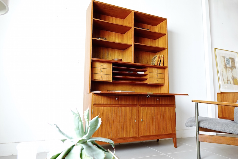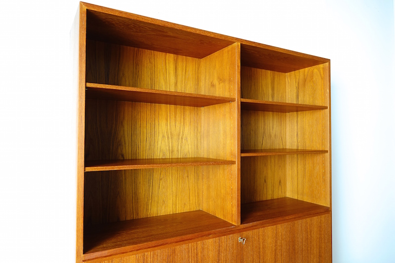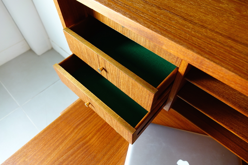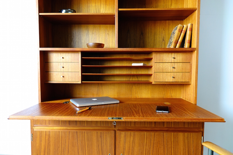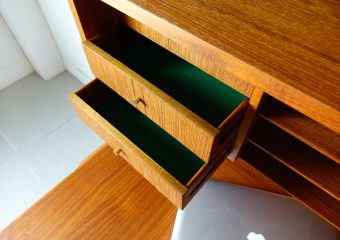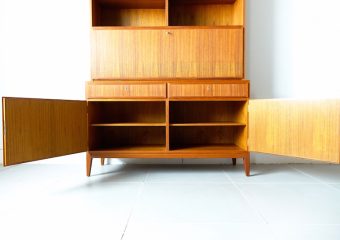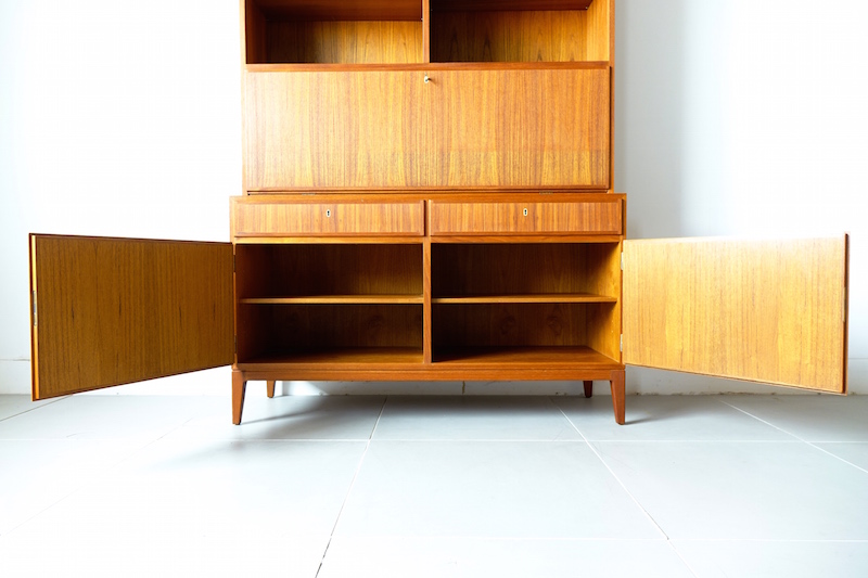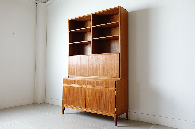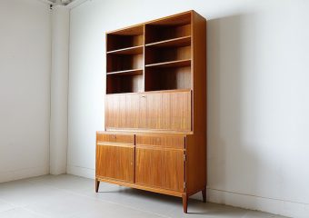 1960年代、Gunni Omannによってデザインされたデンマークの高級家具メーカーOmann Jun社製のビンテージキャビネット。 上段からブックシェルフ、ライティングデスク、キャビネット。 全ての棚板が細かく可動し取り外し可能、全ての引き出しの底にはフェルトが貼られるなどデザインと機能性がとても良く調和した作品です。 収納家具以外にもメインのワークデスク、子供の勉強机兼用など、生活の中の重要な存在を担う役目を果たしてくれます。
