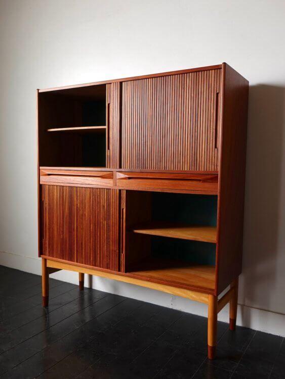 1950年代に巨匠Ib Kofod LarsenよってデザインされたFredericia製の蛇腹式のキャビネット。上下に備わった美しい蛇腹の扉を開くと背部にグリーンを纏った稼働棚付きの収納スペース、中央部の非常にユニークな取手の引き出しにも共通のグリーンカラーのアクセントを持ちます。脚部はビーチ材をベースにチーク材のブーツを履かせるなど、どこを見てもミッドセンチュリーデニッシュデザインの魅力が溢れる貴重で素晴らしい逸品です。