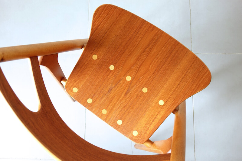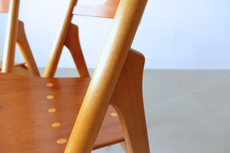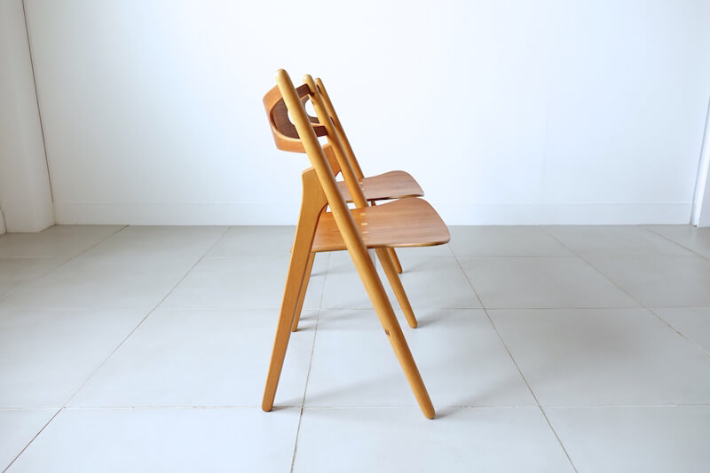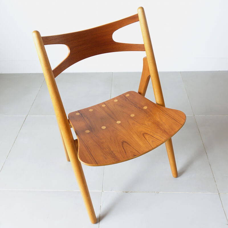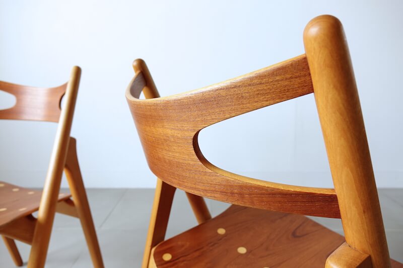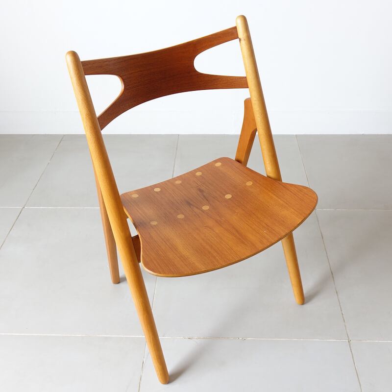 1952年にHans J. Wegner(ハンス・ウェグナー)がカール・ハンセン&サンより発表したヴィンテージチェア”CH29”の非常にレアな初期の板座モデルです。木工職人が用いるソーバックいわれる作業台に構造が似ていることから、ソーバック・チェアとも呼ばれています。経年変化したチーク材のプライウッドは美しい曲線でコンパスのように独特なフレームに支えられ、軽量で移動し易い利便性を持つと共に、プライウッド特有の曲線が身体を程よい角度で支え、確かな座り心地を表現されています。ウェグナーのデザインしたダイニングチェアの数々の中でも、デザイン、座り心地の良さは決して引けを取らない大変エレガントな名作椅子です。
