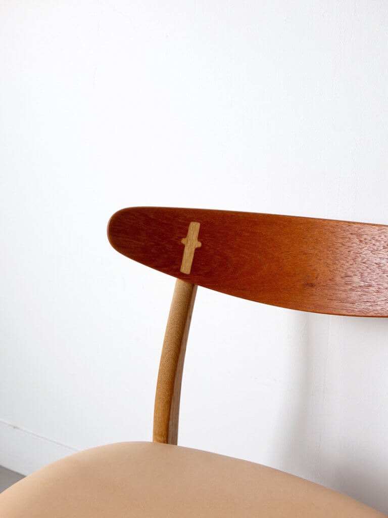 1952年にHans J. Wegner(ハンス ウェグナー)がデザインしたCarl Hansen & Son社製のダイニングチェア”CH30”。素晴らしい座り心地で北欧ヴィンテージ愛好家から高い人気を誇るこの椅子は、背もたれをオイル仕上げで飴色に経年変化したチーク特有の色味に、脚部のオークは白木の風合いを際立たせるためあえてワックス仕上げを施すことで、その異素材の美しいコントラストが際立つという、現地で発見される当時のチーク/オークの組み合わせがオイル&ソープで施されていた経緯を元に、ベルベット創業以来の拘りでCH23とCH30等のチーク/オークのプロダクトは今も同様の仕上げにてご提案させて頂いております。また座面はヌメ革にて新たに張替え、年月と共に革の経年変化もお愉しみ頂ける特別な逸品に仕上がりました。