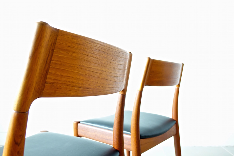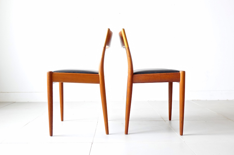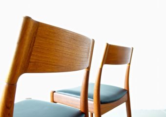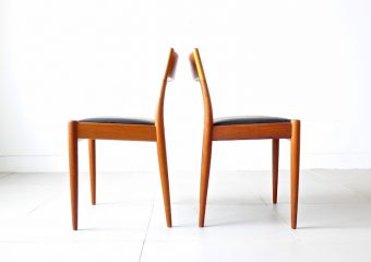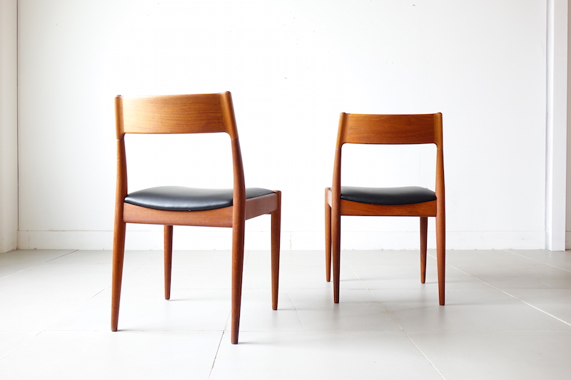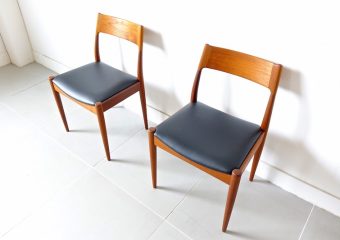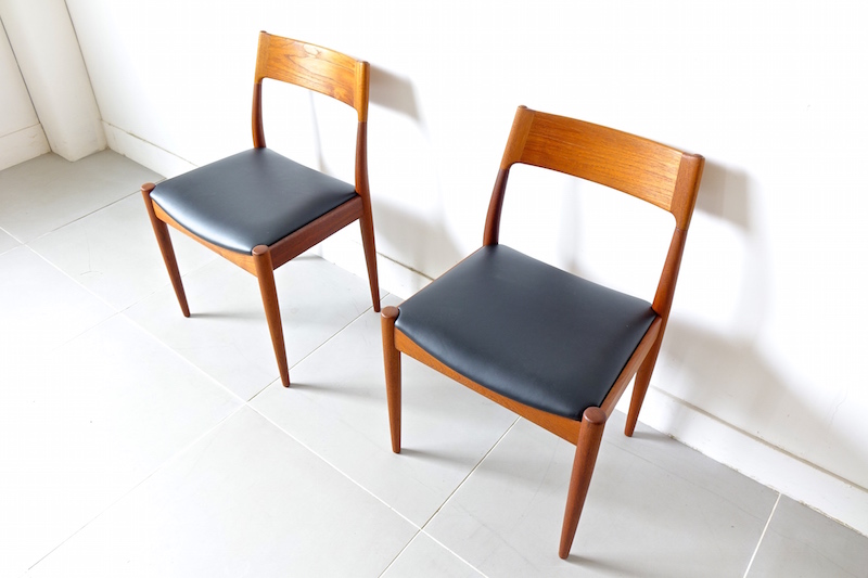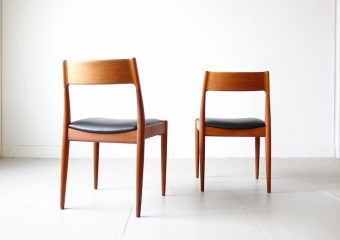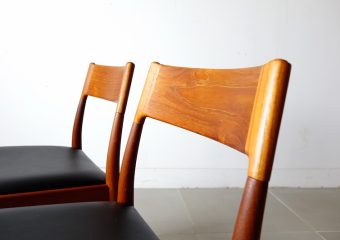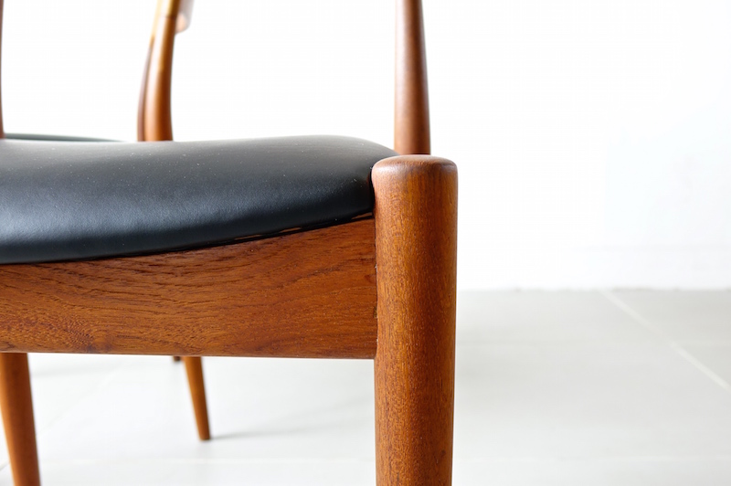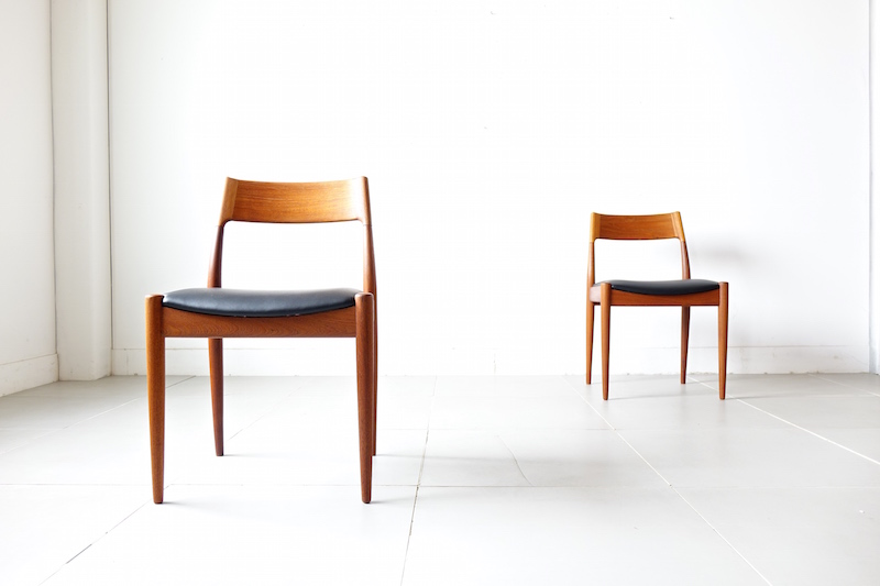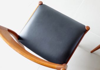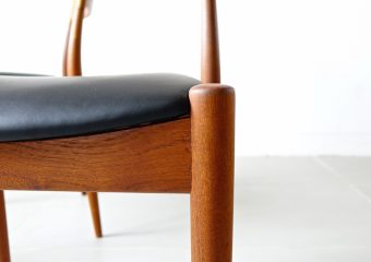 1960年代、デンマークのMogens Kold(モーエンス・コード)社より発表されたダイニングチェア。経年変化で赤みの増したチークにレザーの座面がモダンでヴィンテージの良さが極限まで引き上げられた仕上がり。絶妙な背もたれの角度と幅が心地良い安楽性を表現しています。