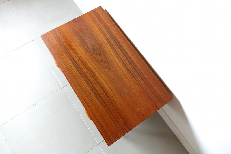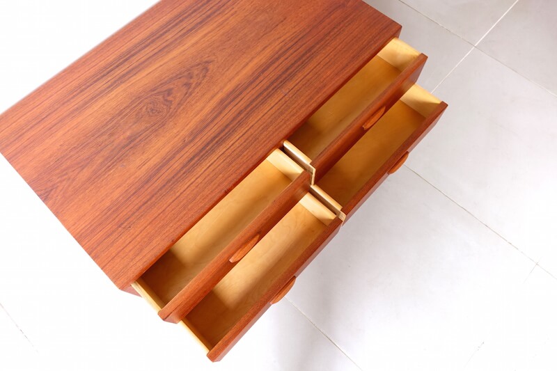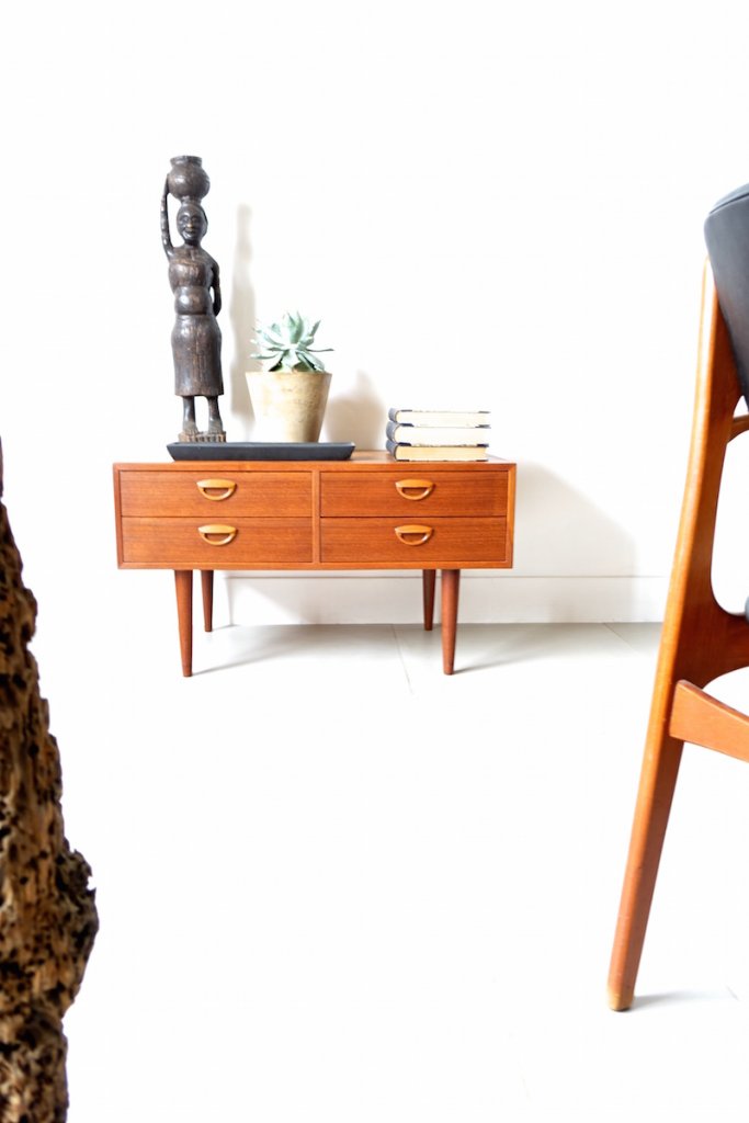 1960年代にKai Kristiansen(カイ クリスチャンセン)デザインによりFeldballes Møbelfabrikより発表されたヴィンテージチェスト。このタイプは元々TVスタンドとしてデザインされたようで、他のスモールチェストと比べ奥行きが深く(51cm)、テレビは勿論のことディスプレイとしても広いスペースが御座います。カイ クリスチャンセン特有の可愛らしい取手とともに空間の素敵なアクセントスポット兼収納としてお使い頂けますと幸いです。