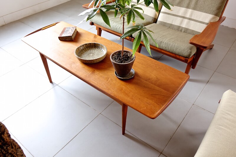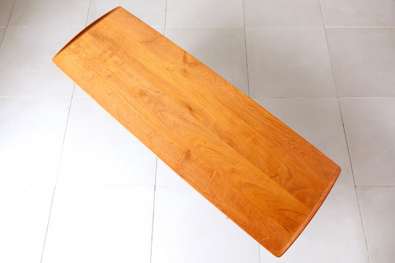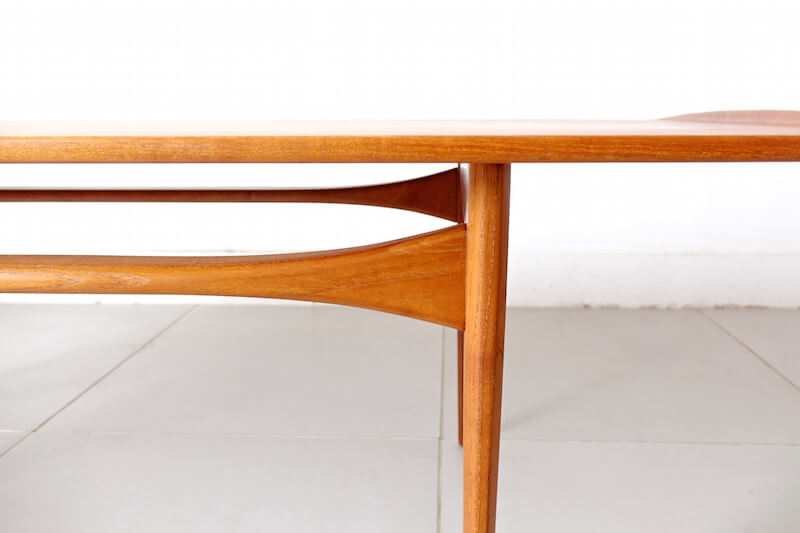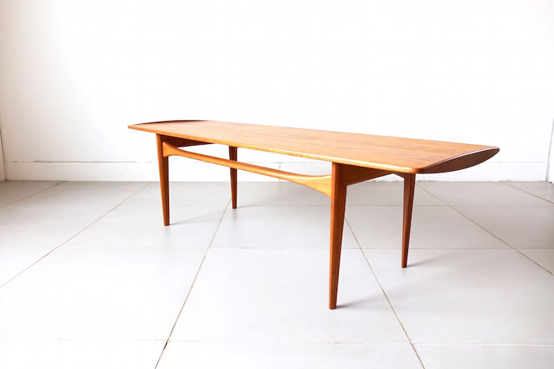 Tove & Edvard Kindt-Larsen(トーベ & エドワード・キンドラーセン)が1960年代にFrance & Son社より発表したヴィンテージコーヒーテーブル。彼らは当時家具デザインだけでなく、建築・グラフィックといった様々な分野で活躍した功績があり、無垢天板端に設けられた筆返しの形状や幕板の形状など、デザインの細部からも彼らのデザインへの拘りとFrance & Sonの技術の高さが窺えます。シンプルでエレガントなシェイプが他のインテリアのテイストにも合わせ易く非常に人気の高い逸品です。