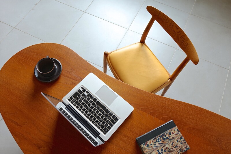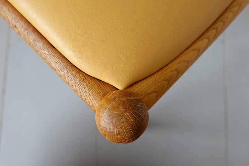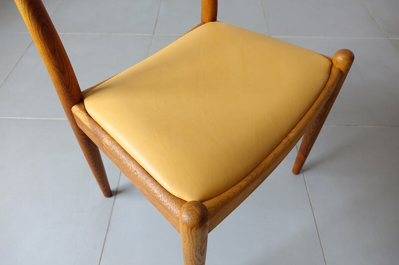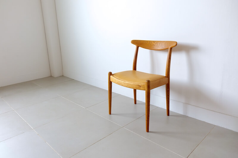 Hans J. Wegner(ハンス・ウェグナー)が1953年にデザインし、彼の多くの名作を手掛けたJohannes Hansenより発表されたレアモデル”JH-1″ダイニングチェア。同時期にC.M.Madsensより発表されていた”W2″によく似たデザインですが、ウェグナーと2社のメーカーがどのような経緯で2モデルを生産したのかはわかっておりません。”W2″との大きな違いは、座枠に厚みをとり、貫を無くしたことで、よりシンプルですっきりとした印象に仕上げたことです。この構造はJohannes Hansenとウェグナーの代表作である”ザ・チェア”と共通したデザインで、Johannes Hansen独自のスタイルが垣間見えるのがポイントです。無垢のオーク材を組み合わせ削り出された背もたれからなる美しい曲線と、新たに張り替えたキャメルレザーがとてもよくマッチした仕上がりとなりました。