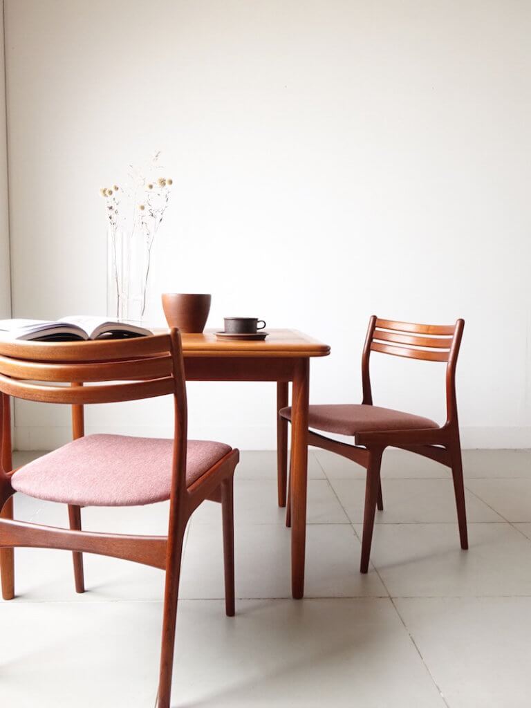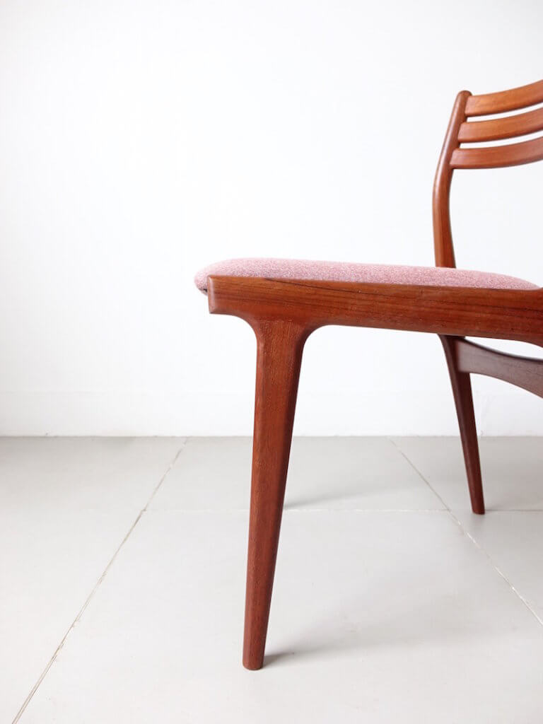 1960年代にJohannes Andersen(ヨハネス・アンダーセン)がデザインを手掛けたUldum Mobelfabrik製のヴィンテージダイニングチェア。一見すっきりとしたシンプルな外観ですが随所にアンダーセンらしい曲線を多用し、背もたれを繋ぐカーブや接合部のデザインなど随所にこだわりを感じる大変クオリティの高い美しい椅子です。ファブリックにはデンマークの老舗メーカー ケアロップ社の生地にて張替え、経年変化したチーク材と美しいコントラストの取れた仕上がりになりました。