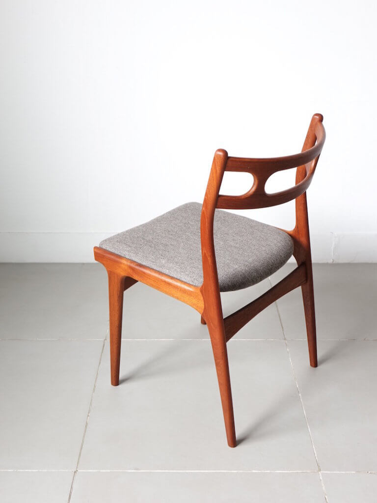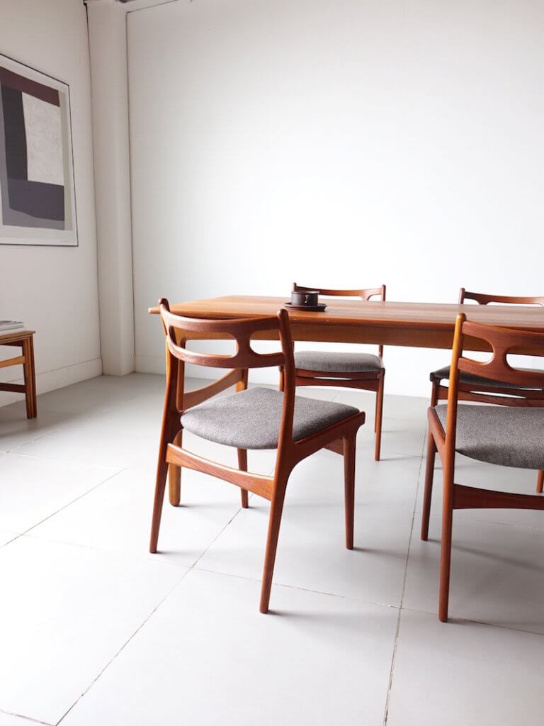 1967年にJohannes Andersen(ヨハネス・アンダーセン)がデザインを手掛けたUldum Mobelfabrik製のヴィンテージダイニングチェア。アンダーセンの特徴的な曲線がふんだんに落とし込まれた、エレガントでとても綺麗なフォルムを持った椅子です。ファブリックにはデンマークの老舗メーカーケアロップ社の落ち着いたグレーを採用。経年変化したチーク材と共にミッドセンチュリーの雰囲気を存分にお愉しみ頂ける仕上がりとなりました。