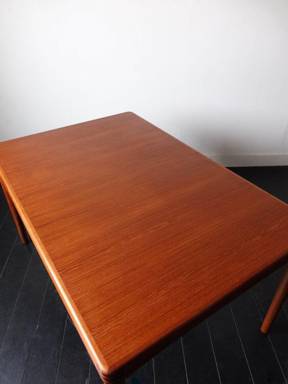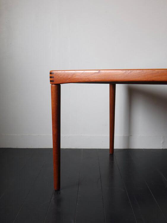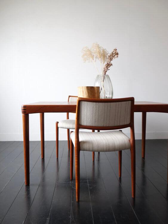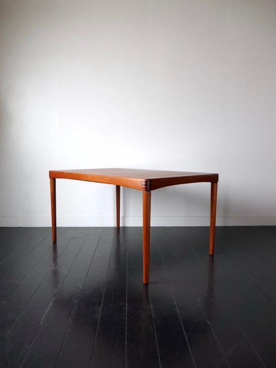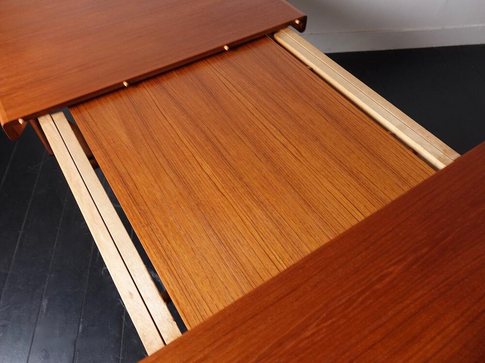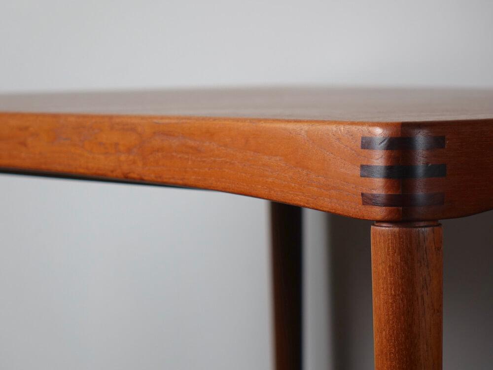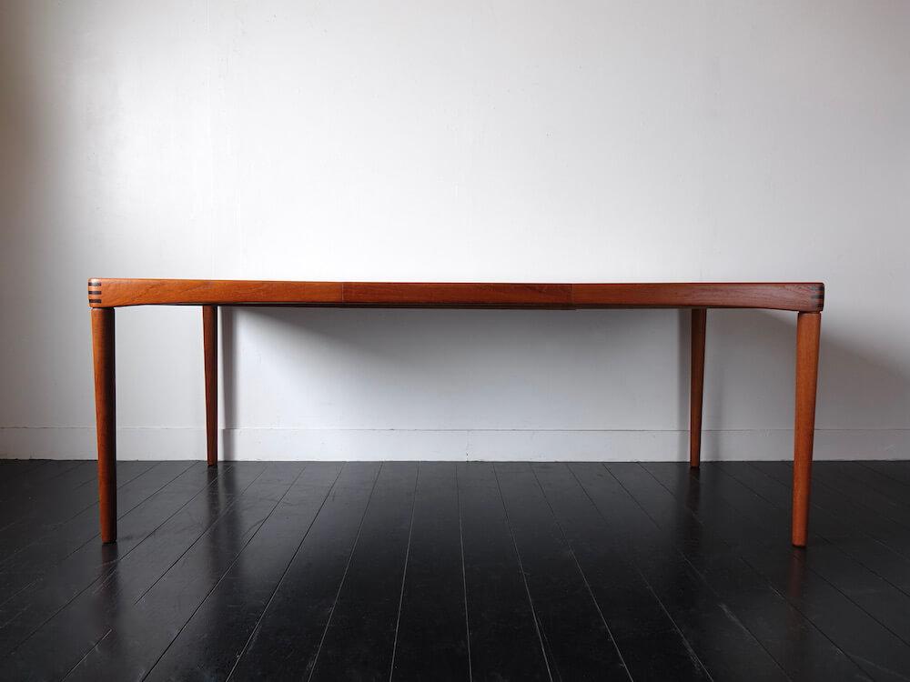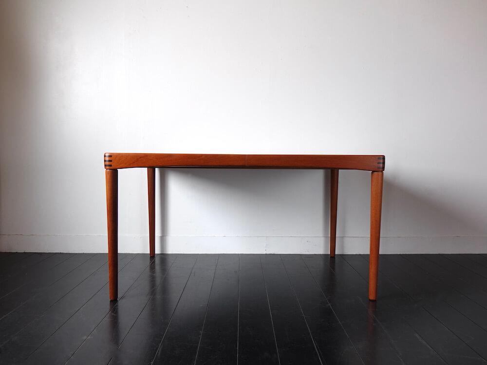 1960年代、ノルウェー人デザイナーH.W.Klein(ヘンリー・ウォルター・クレイン)がデンマークのBraminより発表したシンプルで個性的なヴィンテージエクステンションテーブル。丸みのあるアーチ掛かった天板、ジョイント加工が施された縁はユニークで、シンプルな形状にアクセントを与えています。内部に収納されたエクステンションで135cmから195cmまで拡張可能。ねじ込み式の脚で通常時の内寸も122cmと4人で広々と座ることが出来るデザインです。