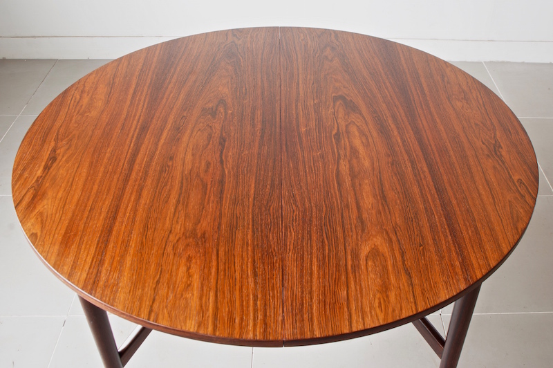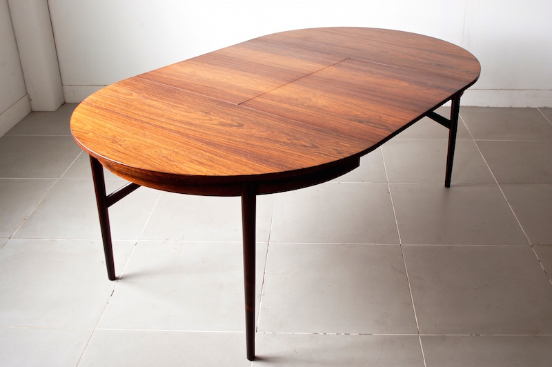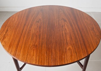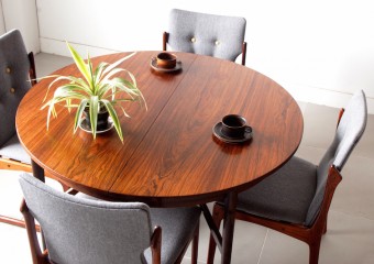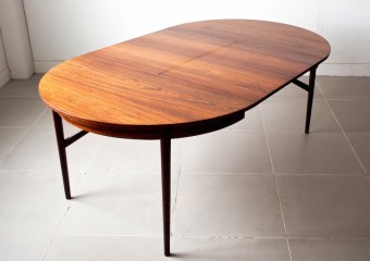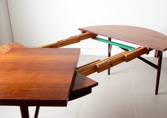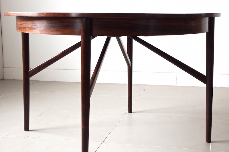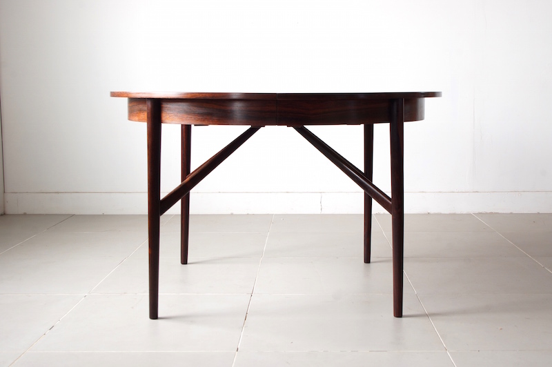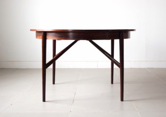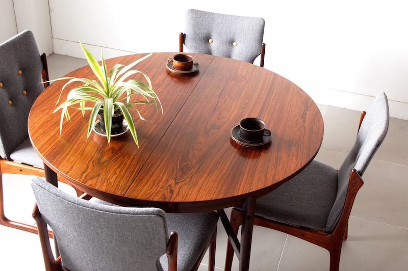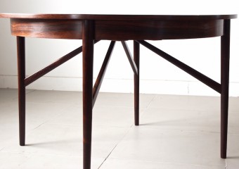 エクステンションが天板下に内蔵された円形のダイニングテーブル。普段は4名での使用でエクステンションを広げると6名~8名が座れるオーバルの大型テーブルに変化します。エクステンションは天板下へ格納されるので場所を取らずに機能的。希少なローズウッド材で作られた質感や木目は美しく重厚な印象を持つ反面、シャープなフレームのデザインが全体をモダンでスッキリとした印象を与えます。