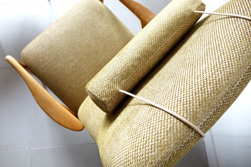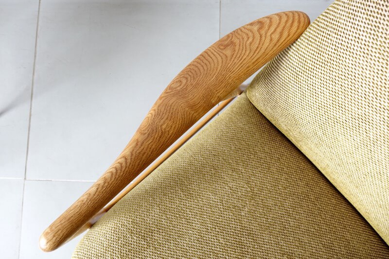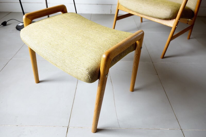 スウェーデンのデザイナー、Alf Svenssonが1960年代にDUX社より発表されたイージーチェアスツールセットです。肘置きから脚にかけての絶妙な曲線美と経年変化したオーク材特有の木目がオーガニックで良い雰囲気を持ちます。ファブリックはJim ThompsonのNo.9 Rice stitchに張替え、サラッとした肌触りで色味共に季節を問わない落ち着いた印象に仕上がりました。リクライニングが可能でスツールに足を置きゆったりとした時間をお愉しみ頂けるかと思います。