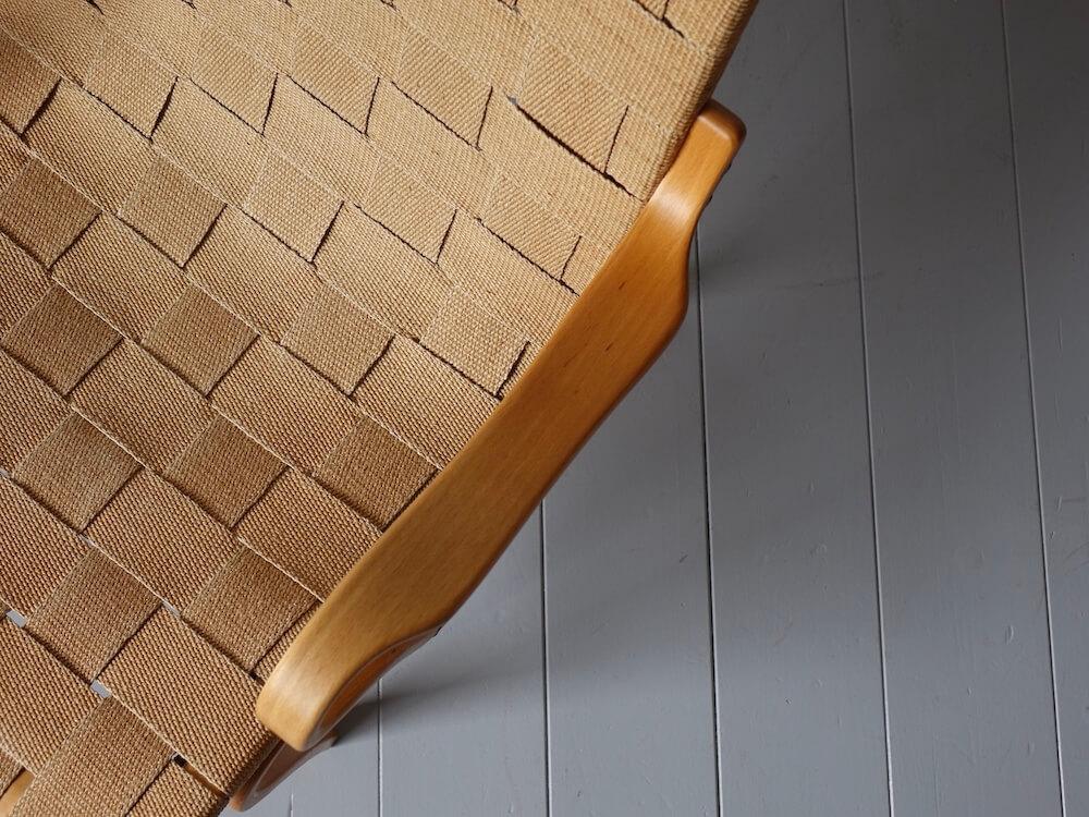 座面には当時からのオリジナルのウェービングベルトがそのまま用いられており、経年による日焼けや色味の変化、使用に伴うシミや毛羽立ちはございますが、使用に支障をきたすようなダメージはございません。