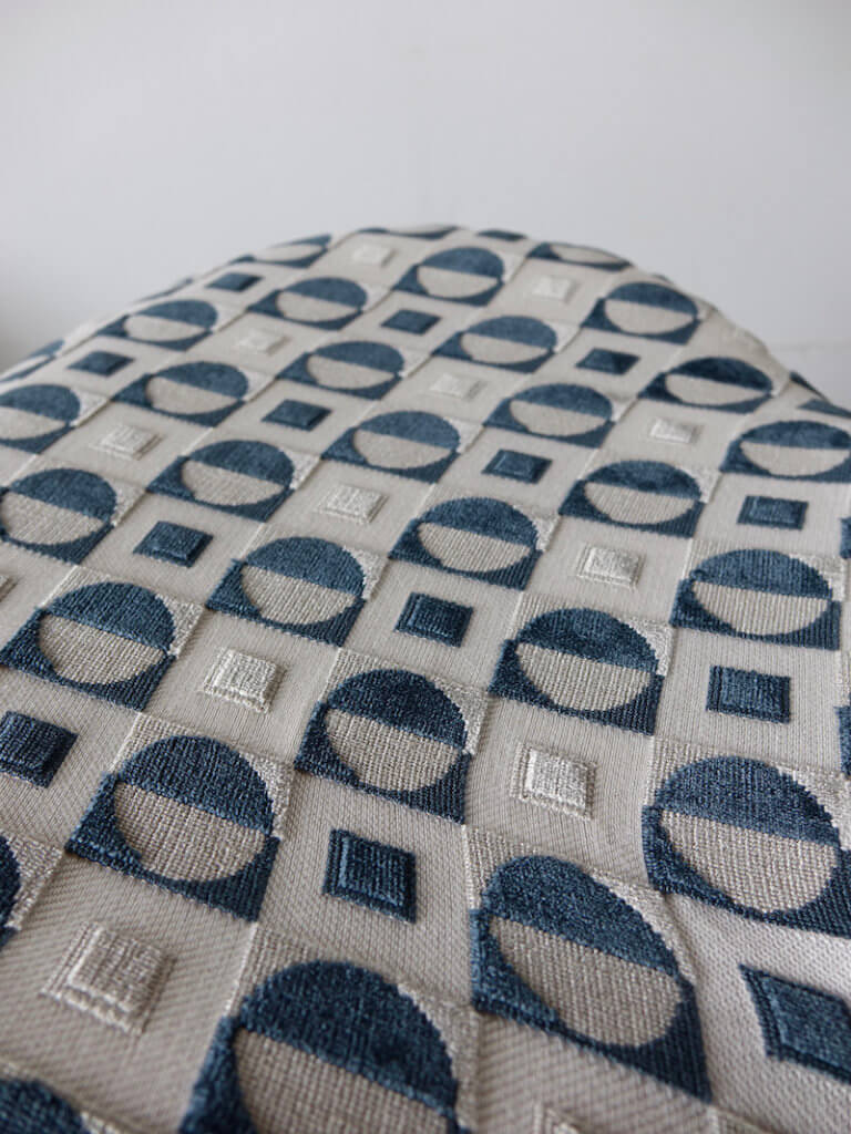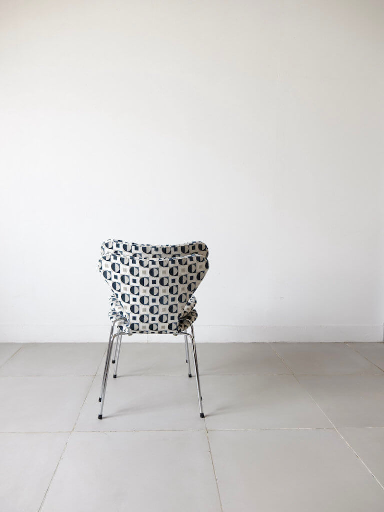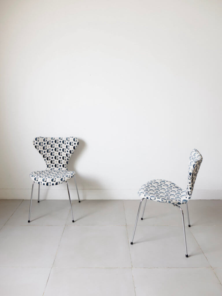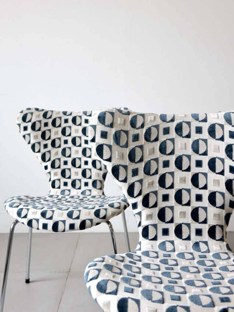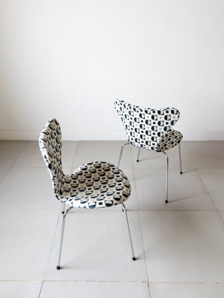 セブンチェア”FH3107″はデンマークの巨匠Arne Jacobsen(アルネ・ヤコブセン)が1955年にデザインし、同国を代表する家具ブランドFritz Hansenより発表されたベストセラーです。こちら2脚は表裏ファブリックのフルパディングで、ファブリックには、高品質かつ上質な生地を展開するスペイン、バルセロナ発のエディターブランドGUELL LAMADRIDの若手デザイナーであるQuintana Partnersが今年発表した60年代に流行した音楽フレンチポップからインスパイアされたファブリックを採用し、セブンチェアのモダンさとGUELLのレトロ感が融合し、アバンギャルドな外観に生まれ変わりました。