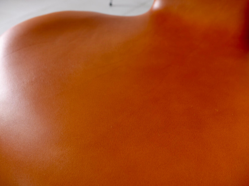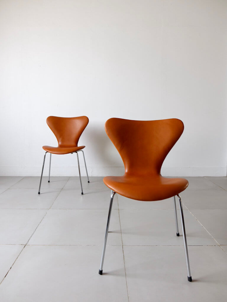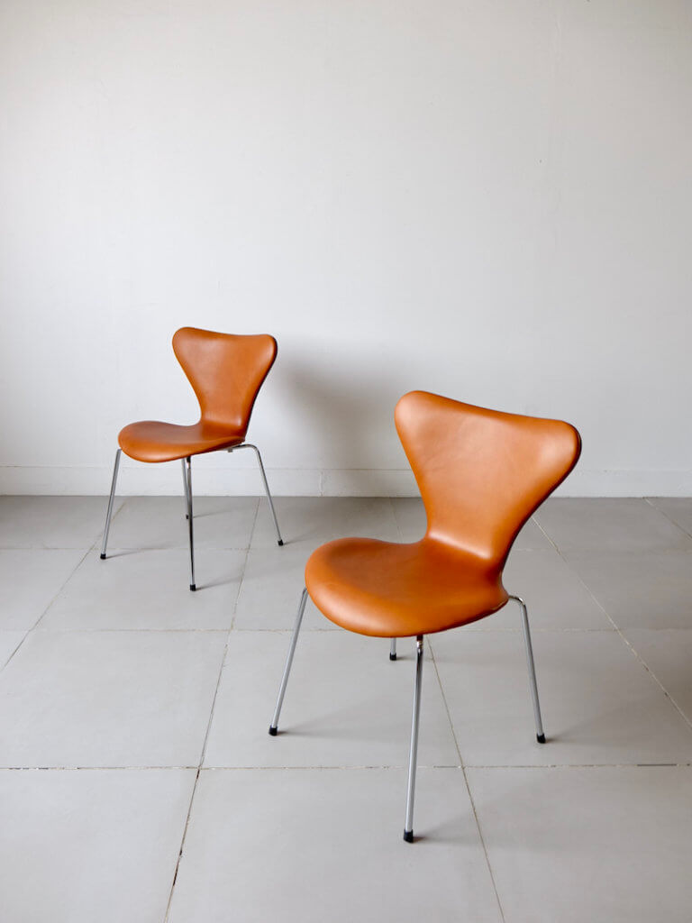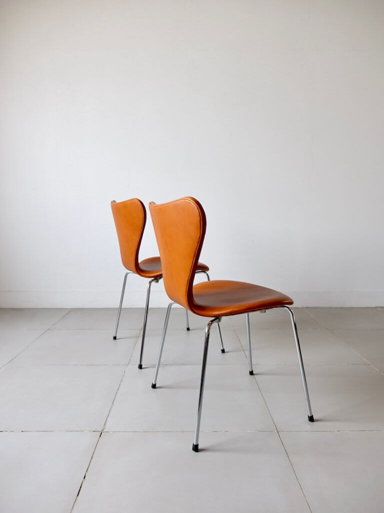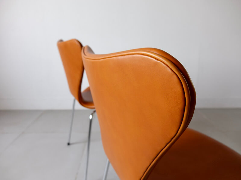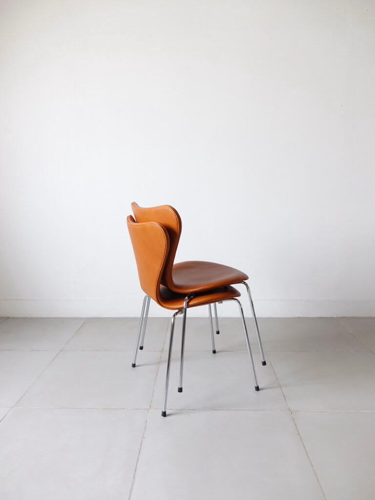 セブンチェア”FH3107″はデンマークの巨匠Arne Jacobsen(アルネ・ヤコブセン)が1955年にデザインし、同国を代表する家具ブランドFritz Hansenより発表されたベストセラーであると同時に、家具の歴史におけるアイコン的存在です。上質なブラウンレザーをフルパディングで張替えどの角度から見ても美しい雰囲気のある仕上がりとなりました。