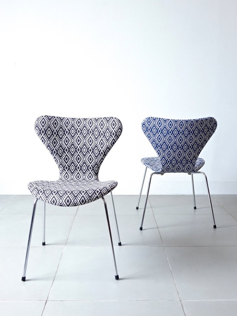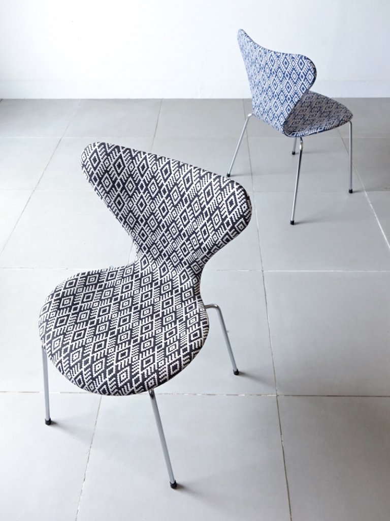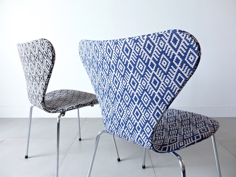 セブンチェア”FH3107″はデンマークの巨匠Arne Jacobsen(アルネ・ヤコブセン)が1955年にデザインし、同国を代表する家具ブランドFritz Hansenより発表されたベストセラーです。こちら2脚は表裏ファブリックのフルパディングで、イギリスROMO社のSORAYAシリーズで新たに張替えを行ないました。SORAYAは柔らかなレーヨンリネンで伝統的な民族柄のような大胆な幾何学模様をジャガード織で表現した生地で金属脚にも大変美しくマッチし、一点物のヴィンテージとしての特別な雰囲気を感じさせてくれます。非常にインパクトのある仕上がりで一脚で空間のアクセントとなるパーソナルな逸品ではないでしょうか。(グレーはSOLDとなりました。)
