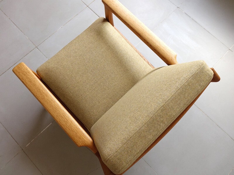 ファブリックはデニッシュアートウィーヴィングのマーブルカラーにて新しく張り替え、経年変化したオーク材に良くマッチした上質で落ち着きのある雰囲気に仕上がりました。木部はフルサンディング、組み直し、再塗装を行い、内部ウレタン、下地材も新たに張り替えておりますので安心してご使用頂けます。