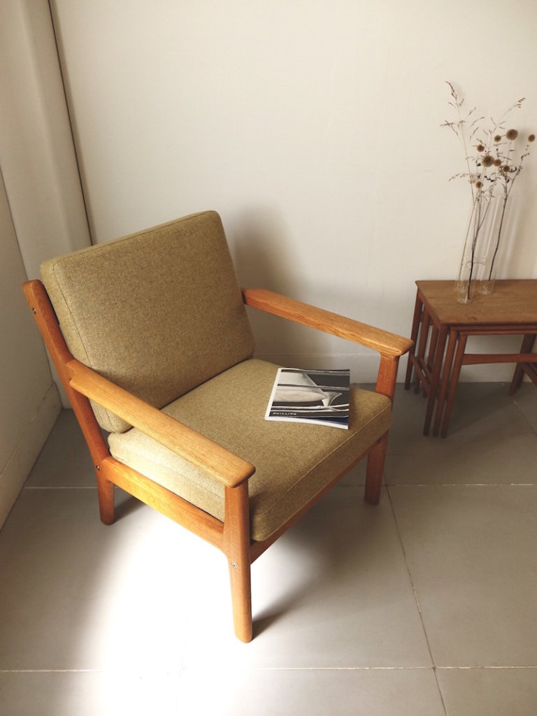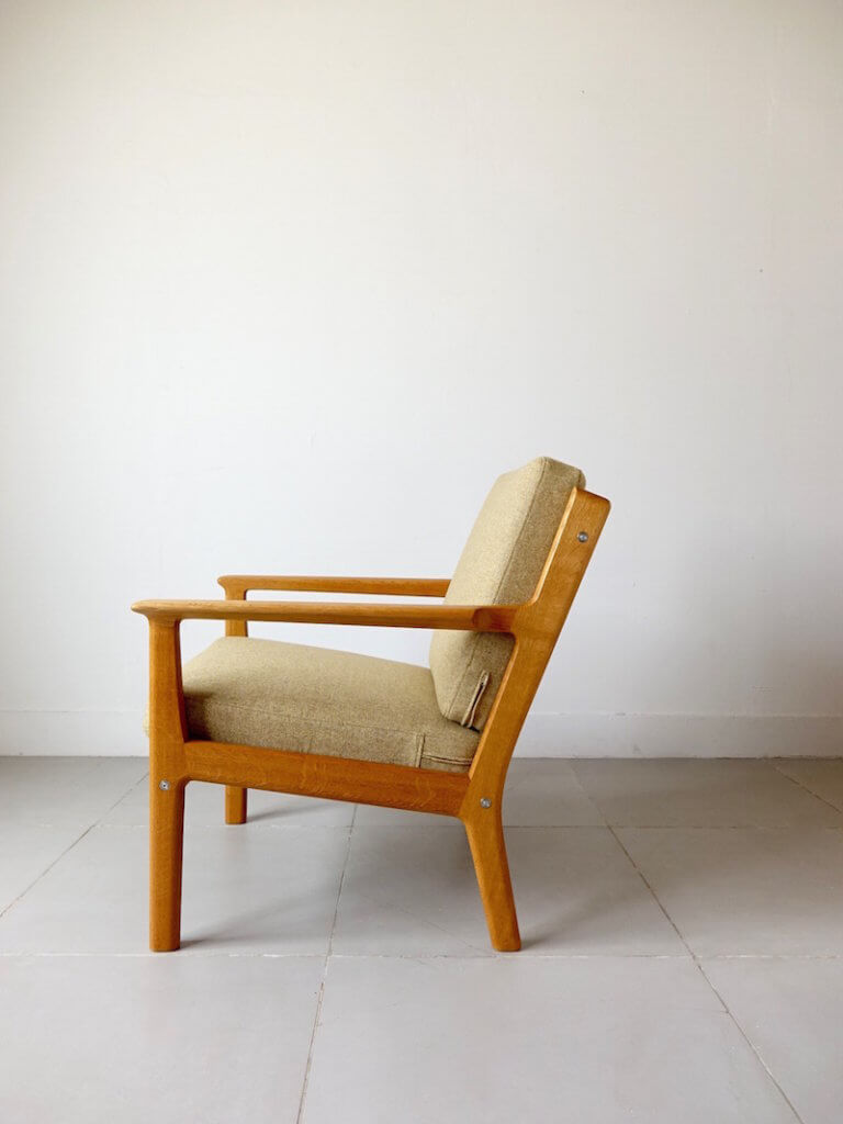 1978年、北欧家具デザインの巨匠Hans J. Wegner(ハンス・ウェグナー)がGETAMA社より発表したヴィンテージイージーチェア”GE265″。同社の名作GE290やGE370に比べると背もたれの角度や座面の傾斜が浅く、座高も42cmと立ち座りの際の負担が考慮されたデザインであることが伺えます。クッションはゲタマ社特有のスプリングタイプで適度に弾力のあるクオリティの高い座り心地を体感出来るのが特長です。