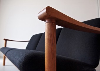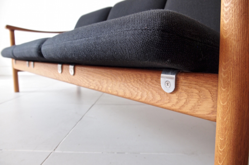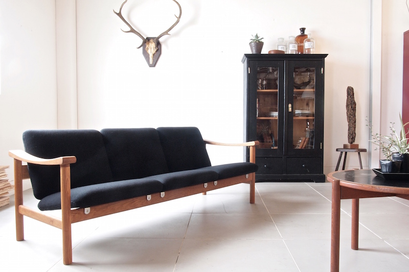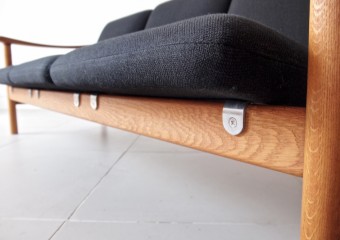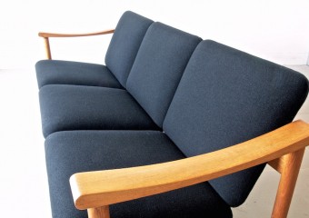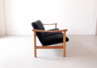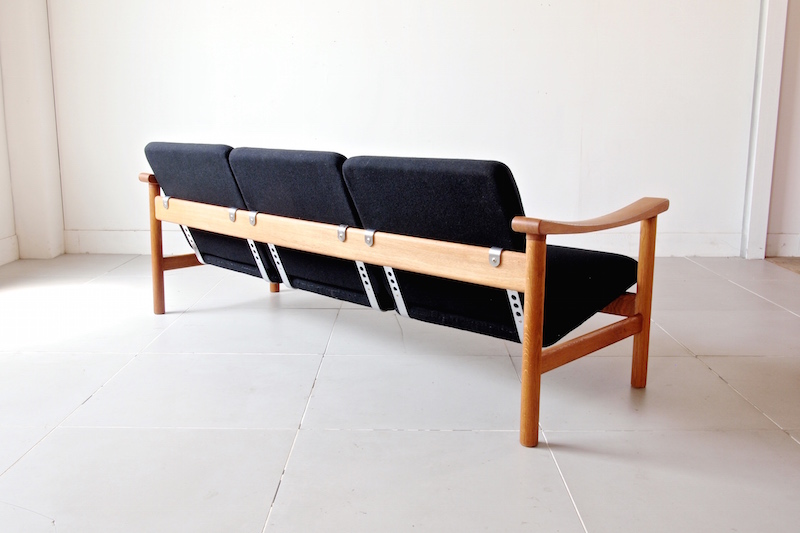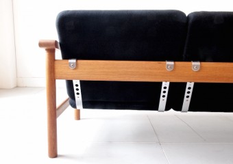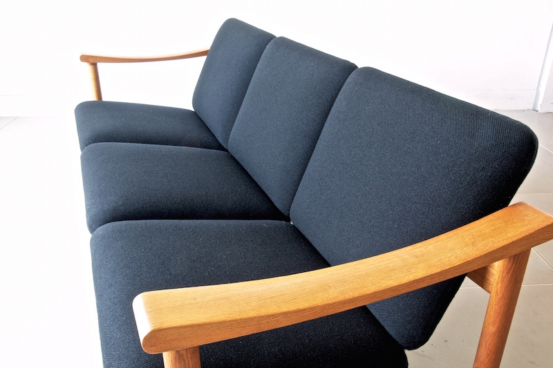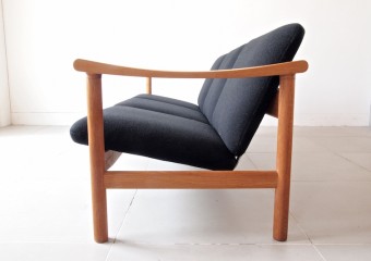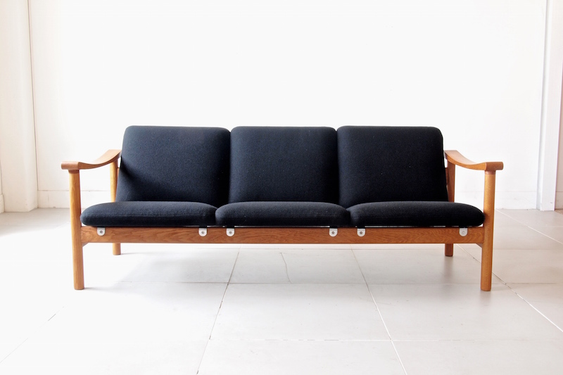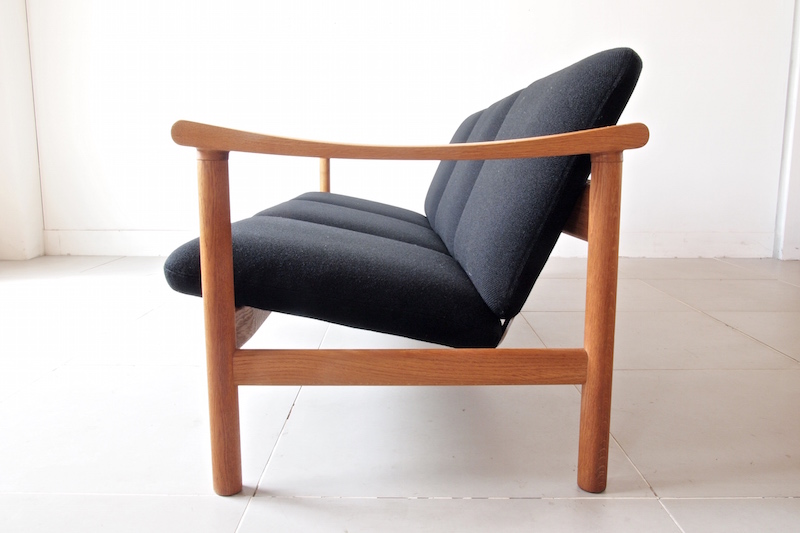 Hans J. Wegner(ハンス・ウェグナー)が1960年にデザインし、GETAMA社から生産されたビンテージソファーGE280。アーム部分の緩やかな曲線がしっくりと腕に馴染む安楽性の高いソファです。座面を金属ステーで吊るという独特の構造やそのデザインにまでウェグナーの拘りが感じられます。防汚加工を施した黒いファブリックでよりモダンな雰囲気に仕上がっております。