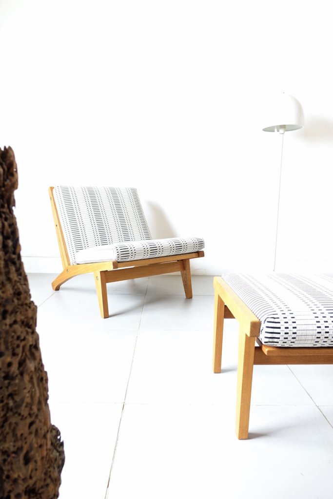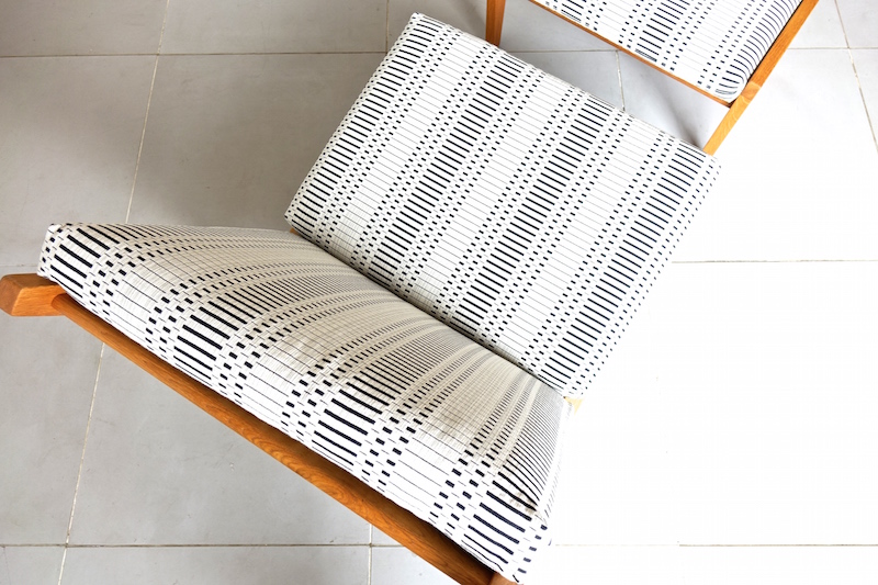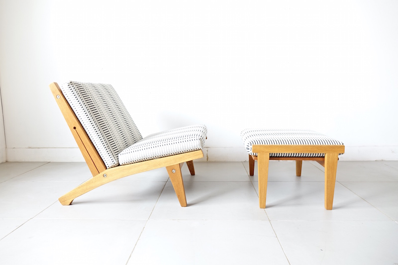 Hans J. Wegner(ハンス・ウェグナー)が1969年にデザインし、彼の多くの作品を手掛けたGETAMAより今尚生産が続けられている名作”GE370″イージーチェア+オットマン。同年にデザインされたハイバックタイプ”GE375”に比べ、奥行きが浅く、アームレスタイプで置く場所を選ばずコンパクトにお使い頂けるのが魅力です。背と座の角度は深くゆったりと身体を預けることが出来、オットマンとのコンビネーションは高い安楽性と共に至福の時間をもたらせてくれます。ファブリックは北欧フィンランドを代表するテキスタイルブランド Johanna Gullichsen(ヨハンナ・グリクセン)のHeliosにて張替え、洗練された現代的なテキスタイルと経年変化したヴィンテージオークとのコントラストが非常に美しい逸品となりました。