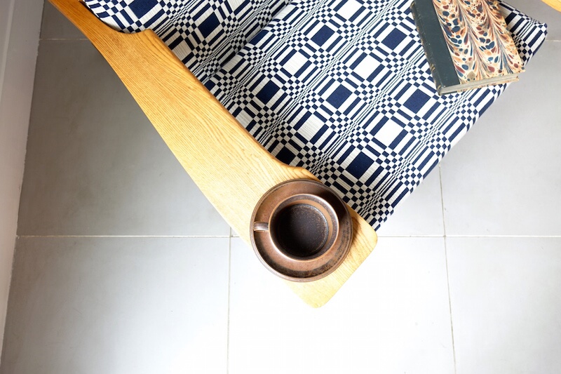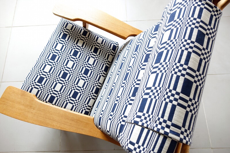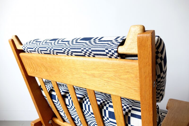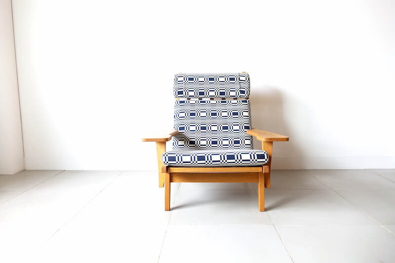 Hans J. Wegner(ハンス・ウェグナー)が1969年にデザインし、彼の多くの作品を手掛けたGETAMAより発表された代表作”GE375″イージーチェア(1Pソファ)。比較的後期に発表されたこの椅子は、培われた多くの経験のもと、「寛ぐ」事にフォーカスがされたプロダクトです(GE375 Sofa by Hans J. Wegner / teak)。飲み物や本などを置けるように造られた幅の広い肘掛や座る方の身長に合わせ枕の位置を調整出来るなどイージーチェア(安楽椅子)として多くの機能性とウェグナーらしいシンプルで美しいディテールを持ちます。ファブリックはフィンランドJohanna Gullichsen(ヨハンナ グリクセン)のDorisを使用。経年変化したヴィンテージオークと爽やかにマッチし、時代を超えて愛されるウェグナーのクラシカルなデザインに、北欧テキスタイルの伝統を新たな視点で解釈されたヨハンナ グリクセンの現代的なエッセンスが加わり美しく仕上がりました。
