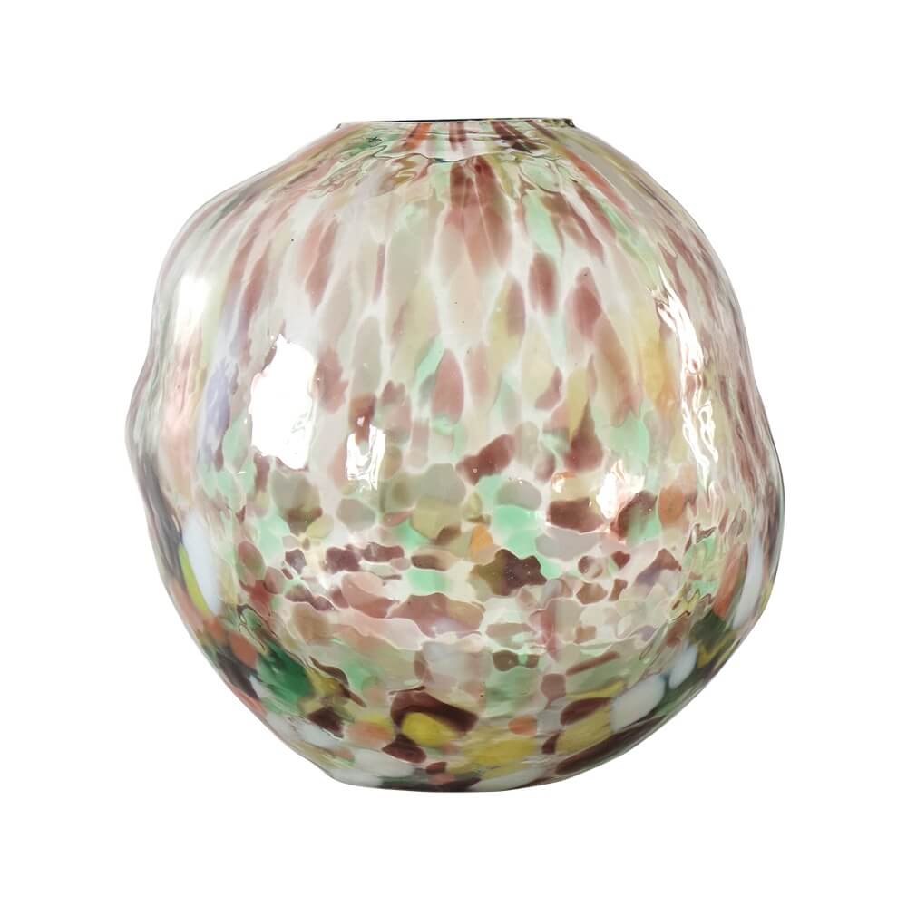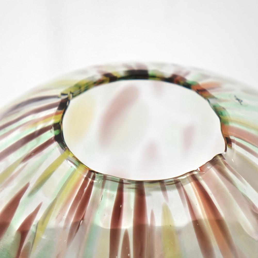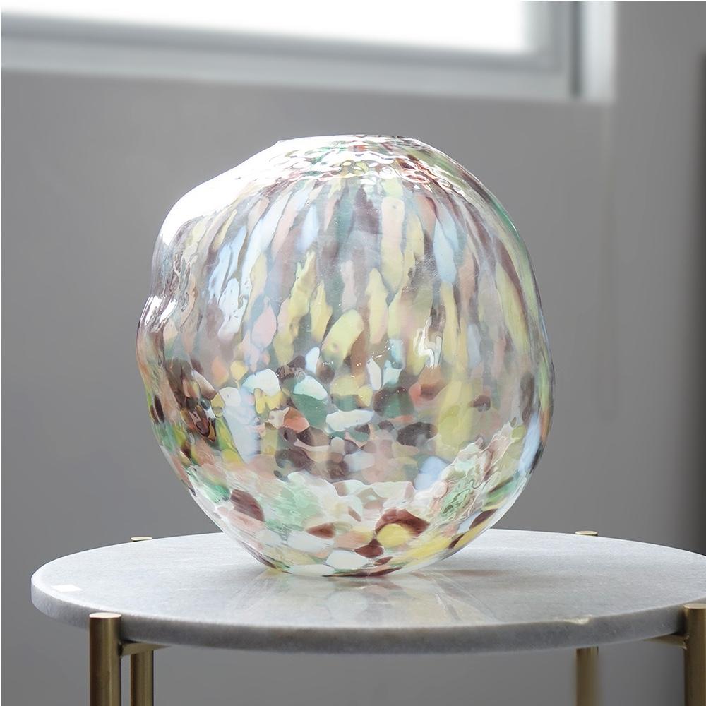 やわらかな丸みを帯びたフォルムに、淡く溶け合うマルチカラーが広がる吹きガラスの花瓶。光を受けるたびに表情を変える色彩と、ガラスの透明感が重なり合い、置くだけで空間に瑞々しい彩りを添えてくれます。