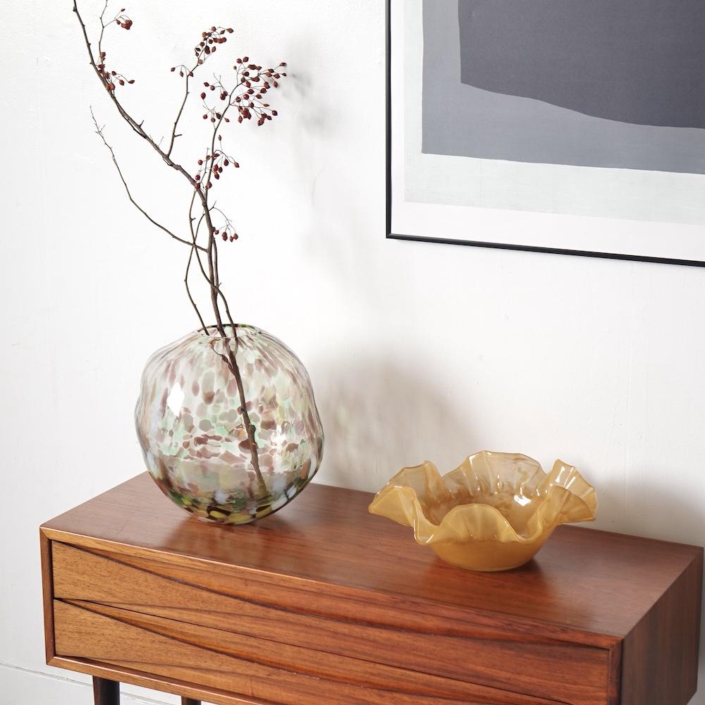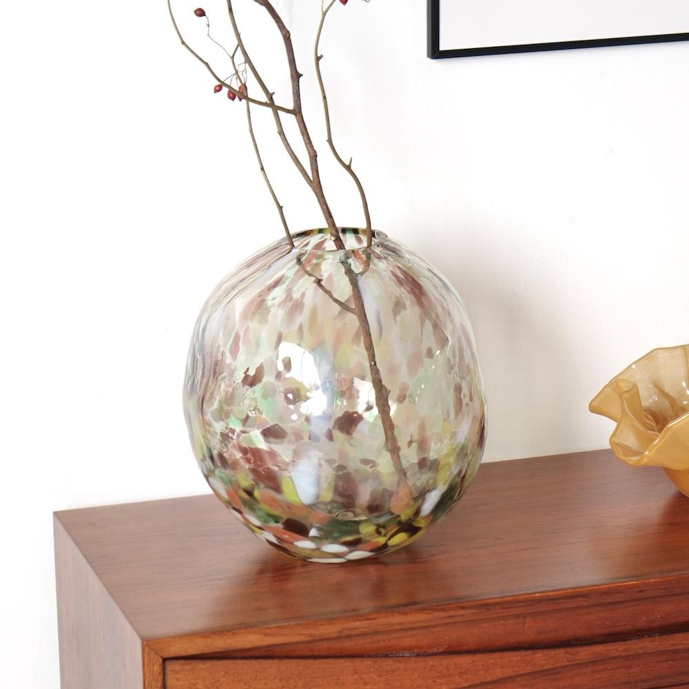 口吹きで一点ずつ成形されているため、気泡やわずかな凹凸、色のにじみがそれぞれに現れ、同じものが二つとない個性を宿しています。直径・高さともに25cmのゆったりとしたサイズは、花束や枝もの、グリーンのアレンジを美しく受け止める存在感。ダイニングテーブルのセンターピースや、窓辺、サイドボード、玄関先など、どこに置いても自然と視線を惹きつけます。