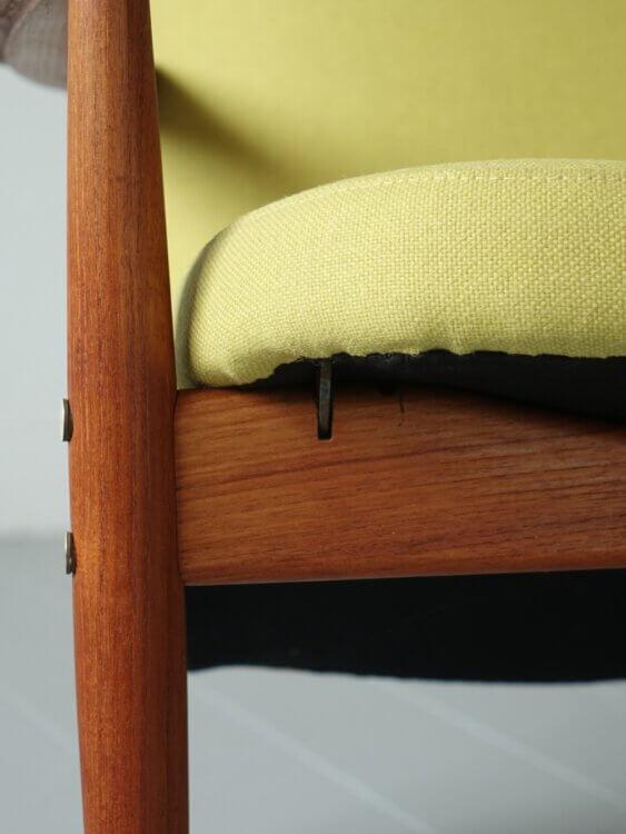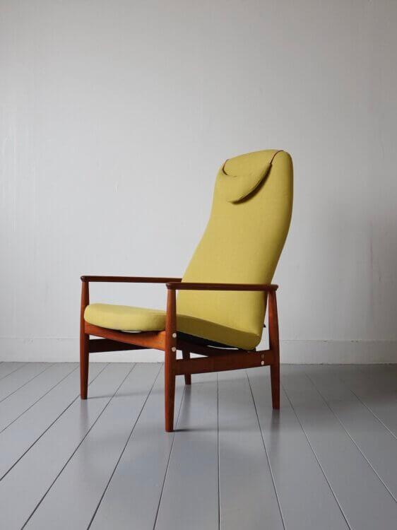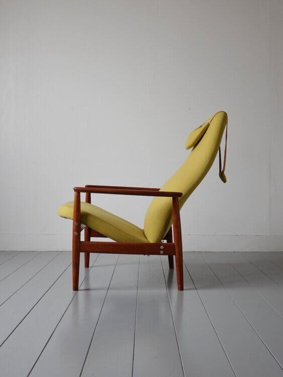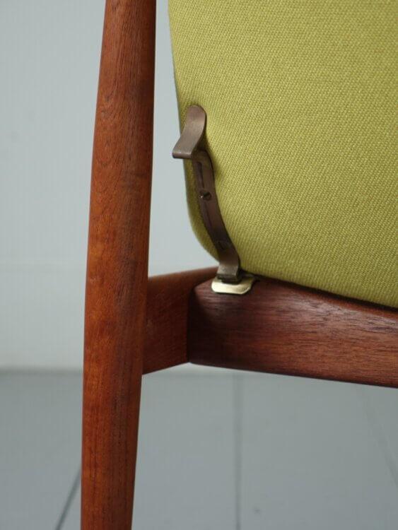 また、座面を持ち上げ手前に起こすことで背もたれがリクライニングする機能を持ち合わせています。構造がそのまま意匠として表れた設計は、当時の北欧家具らしい合理性と美しさを感じさせます。