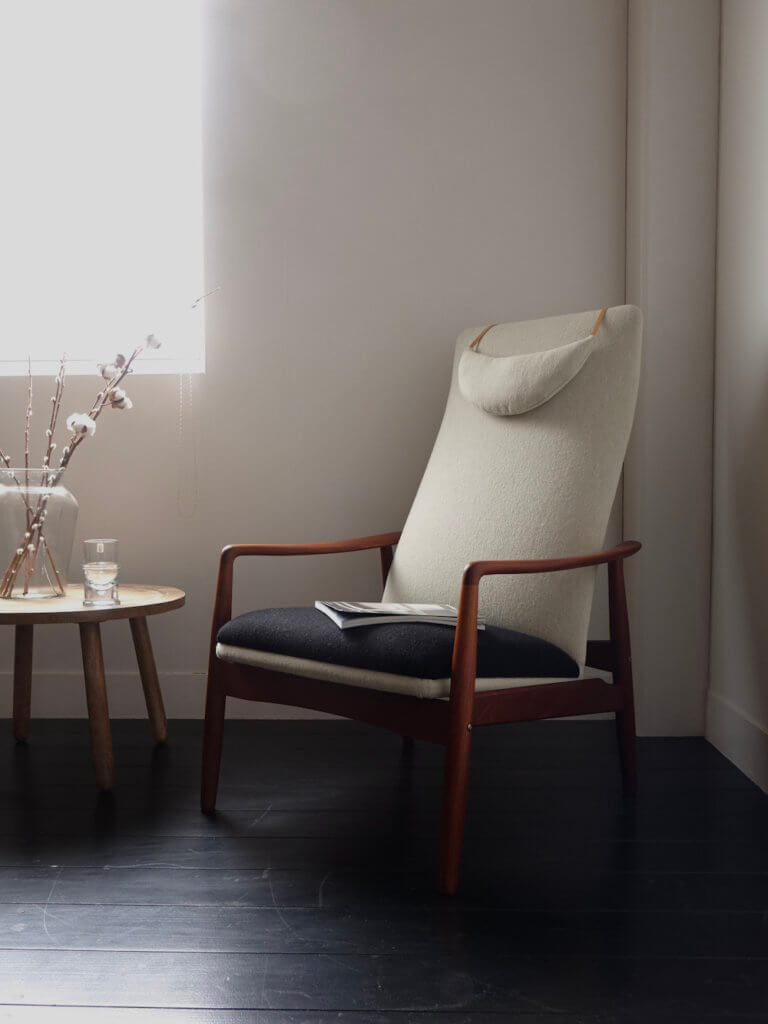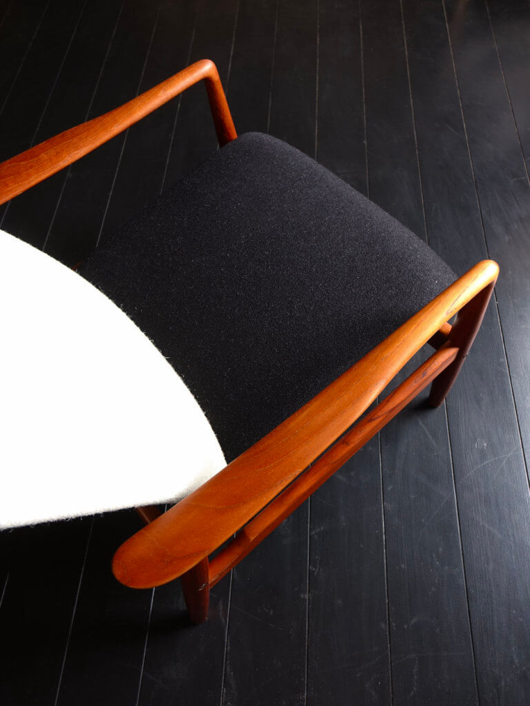 経年変化した美しいチーク材に合わせファブリックにはデンマーク老舗のケアロップ社の落ち着いたオフホワイトとブラックの2トーンカラーを採用し、様々なテイストに合わせ良い上質な仕上がりとなりました。