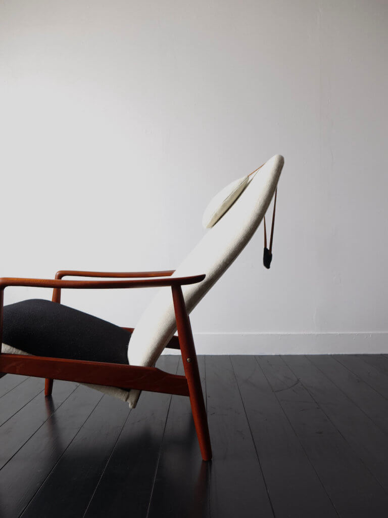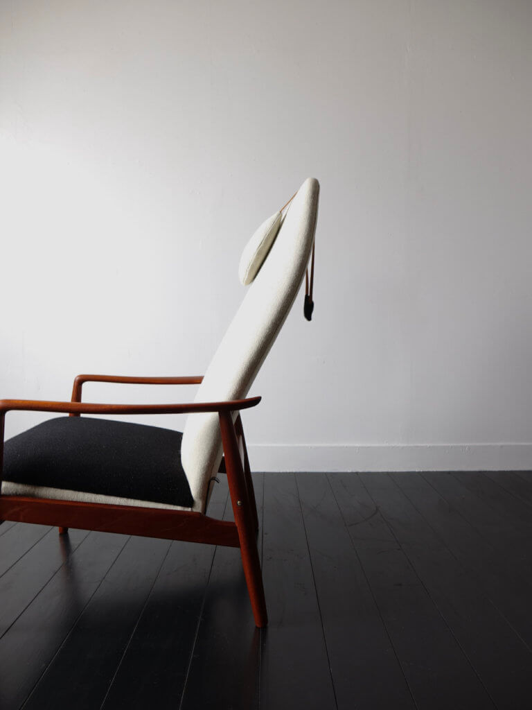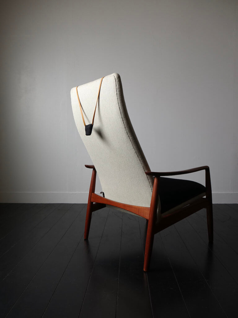 1960年代にデザイナーSøren LadefogedがデンマークのSL Moblerより発表したリクライニング式のヴィンテージラウンジチェア。削り出されたチーク材の丸みを帯びた美しい曲線のフレームは、なめらかで肘あたりが良く、背骨を模ったかのような背もたれの曲線とともにSøren Ladefogedらしい有機的な外観が特徴的ハイバックチェアです。背もたれの三日月型の枕はヌメ側のベルトと共に美しいアクセントに、体を預けると頭から背中、お尻、肘、脹脛とそれぞれの箇所を的確に支えてくれる高い安楽性を持ちます。