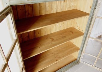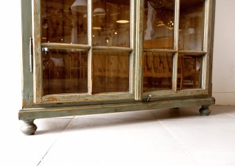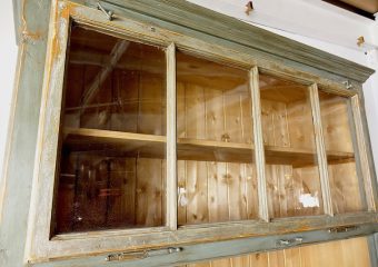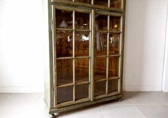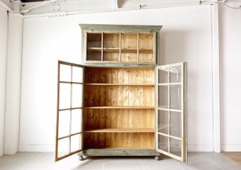 巨大なインパクトと経年のヴィンテージの風合いが漂うヨーロッパのアンティークキャビネット。 観音開きの扉を開けると三段の棚板、上段は上から下に開く少し変わったデザインをしております。 ショップのディスプレイ収納としては抜群の収納力機能性を持ち、空間を決定的に印象付ける役割を担います。